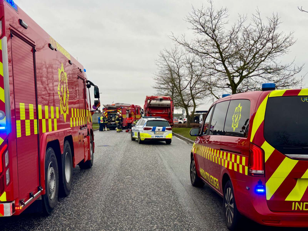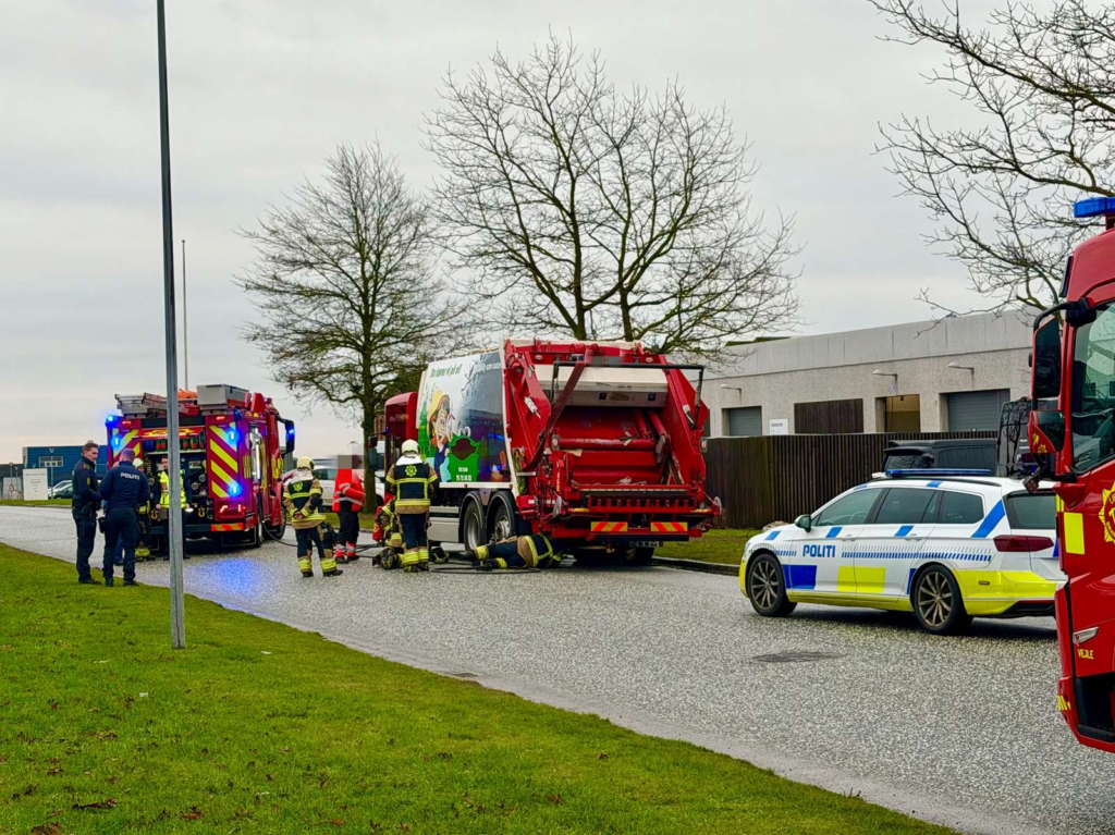 Billeder fra stedet viser, at det er en skraldebil, der danner omdrejningspunkt for mandskabets arbejde.