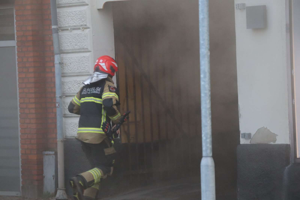 Den voldsomme brand finder sted lige nu på Smedegade i Slagelse, hvor brandvæsenet forsøger at få dæmpet branden.
