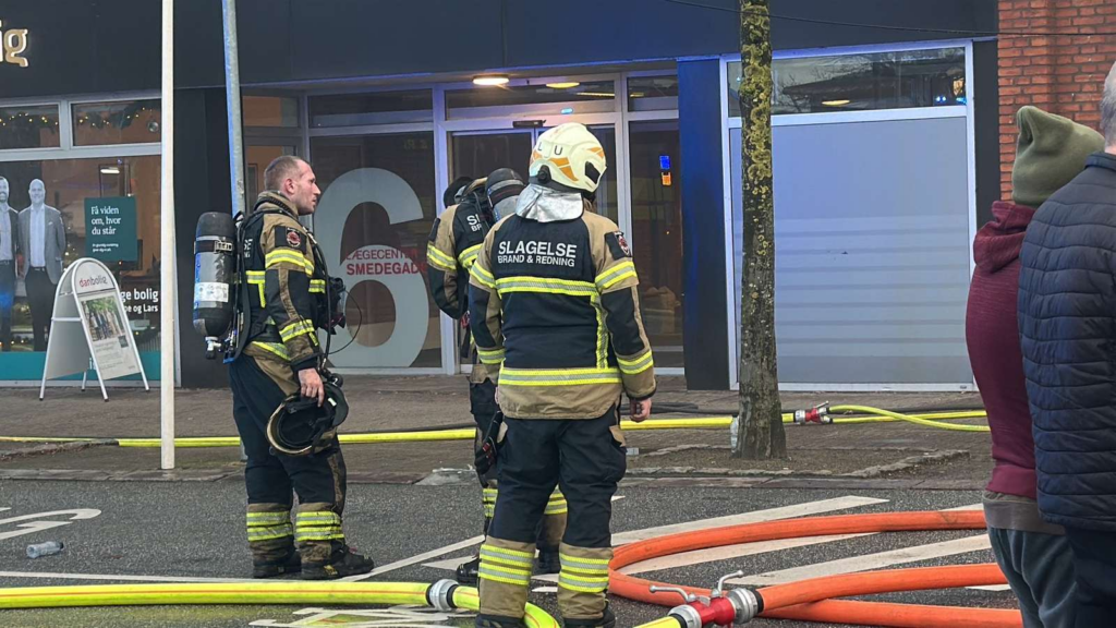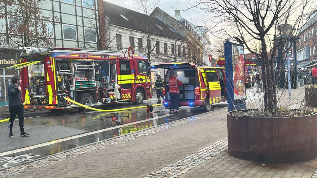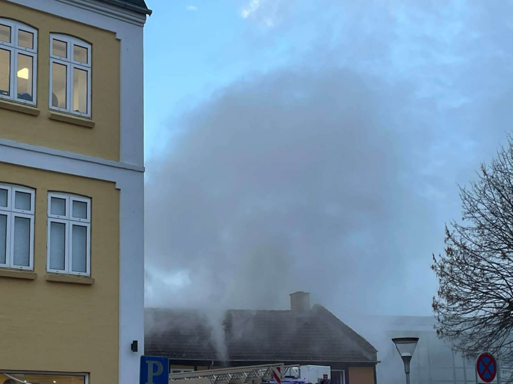 ‘Branden udvikler kraftig røg, som driver ud over nærområdet. Vi opfordre til at borgere i området ved Smedegade og Rådhuspladsen holder sig indendørs, lukker døre og vinduer samt slukker evt. ventilation,’ skriver politikredsen.