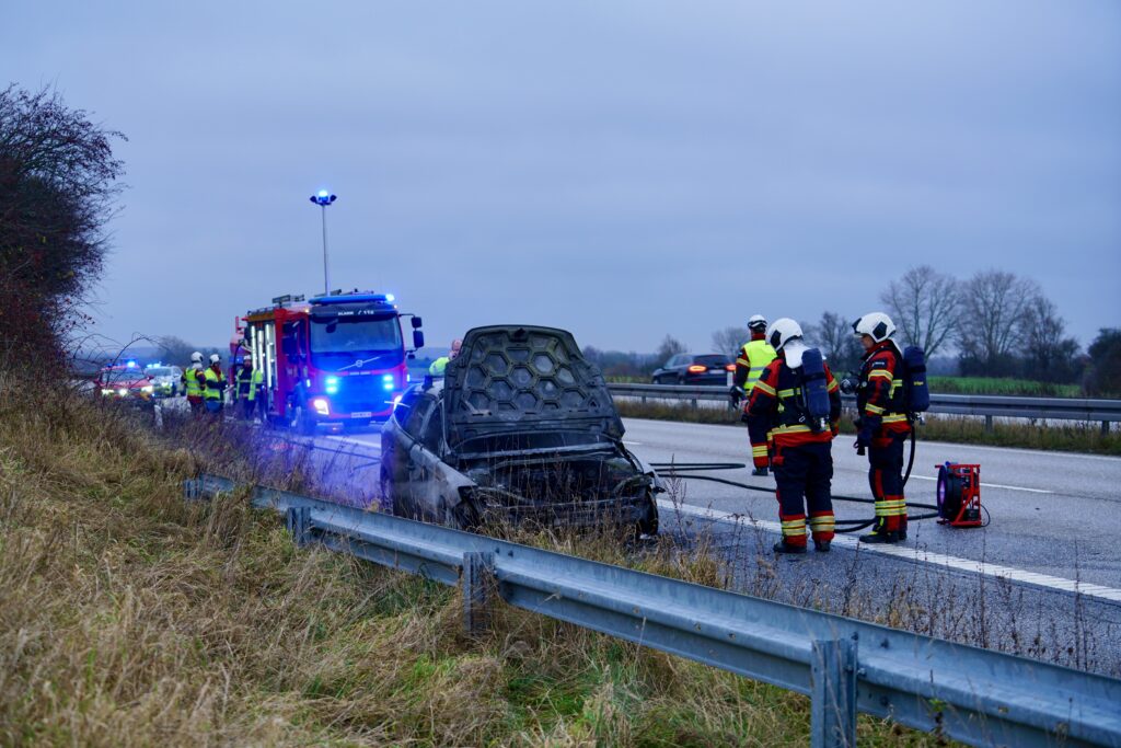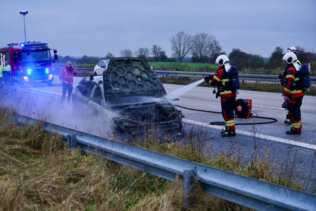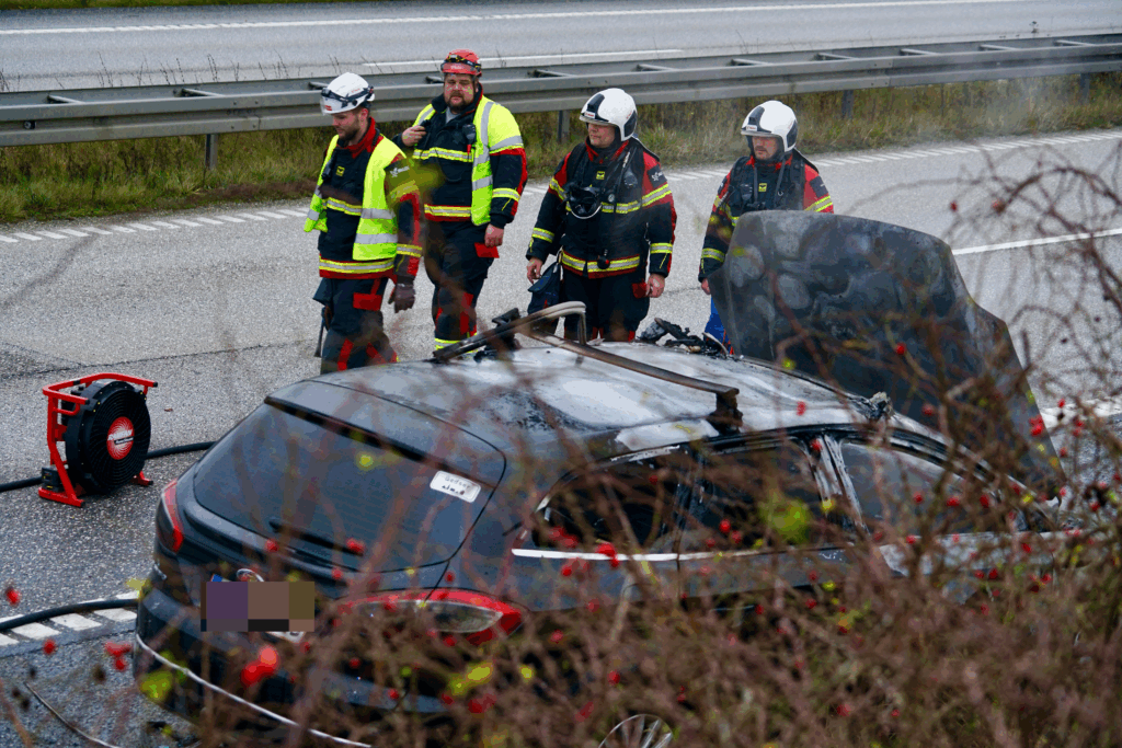 Politiet og brandvæsenet rykkede hurtigt ud til en bilbrand midt på motorvejen. Presse-fotos.dk er også fremme, og på vej til stedet kunne redaktionens udsendte se en sort røgsky fra branden stige mod himlen på flere kilometers afstand.