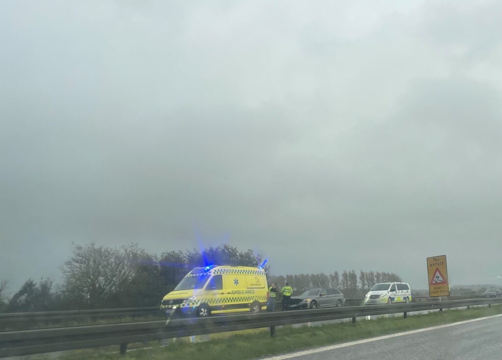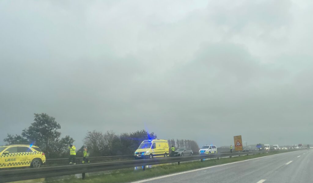 Billeder fra stedet viser, at en personbil holder i nødsporet, mens der både er politi, ambulance og lægebil til stede. Der er samtidig blevet skabt en større kø bag ulykken.