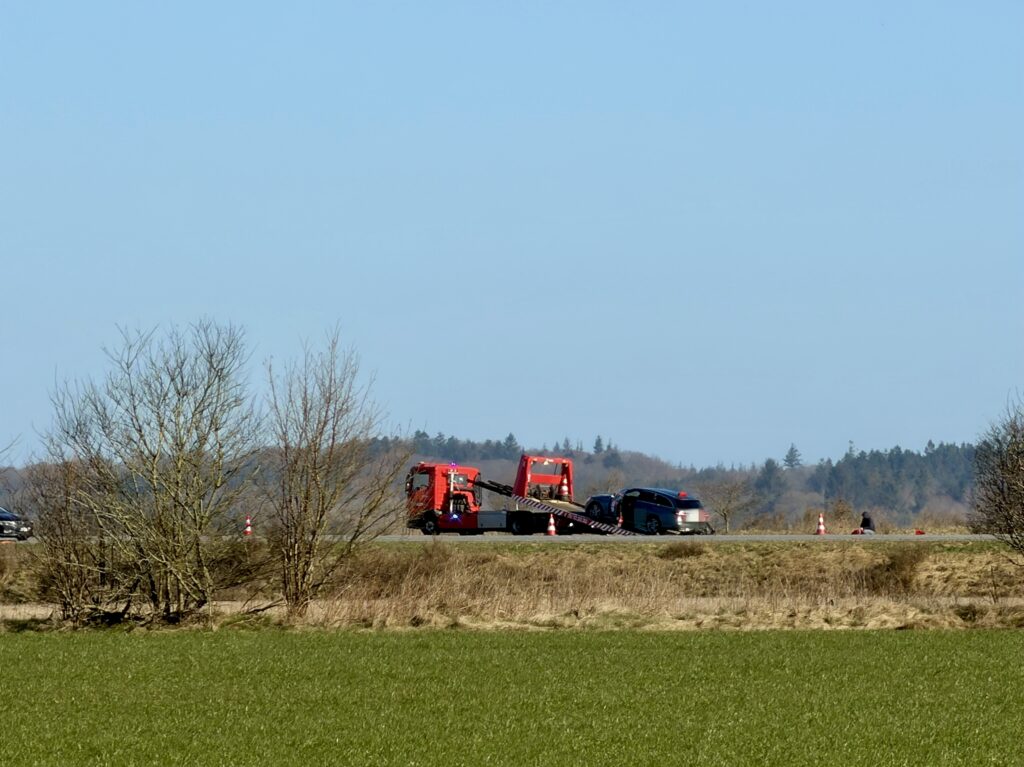 Uheldet spærrer et spor på en trafikeret landevej, hvor skiltvogn og autoservice er på stedet.
