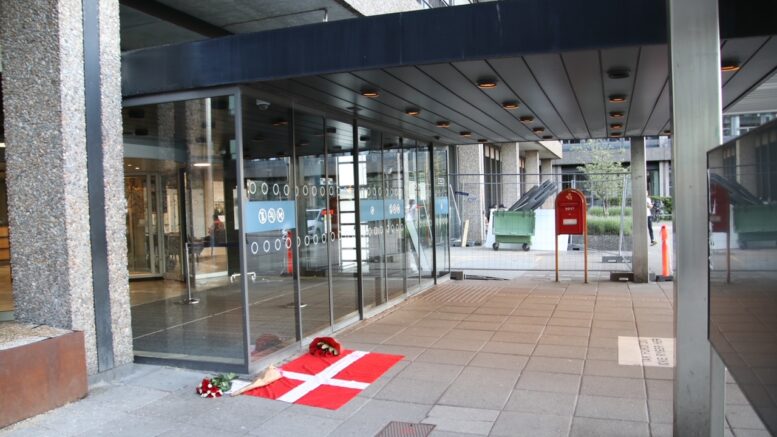 Blomster og flag foran Rigshospitalet for Christian Eriksen