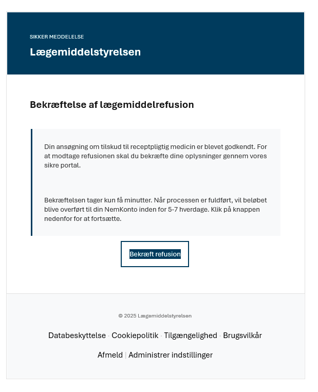 ‘Din ansøgning om tilskud til receptpligtig medicin er blevet godkendt. For at modtage refusionen skal du bekræfte dine oplysninger gennem vore sikre portal.’