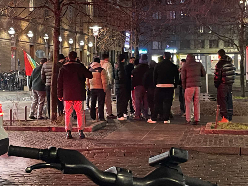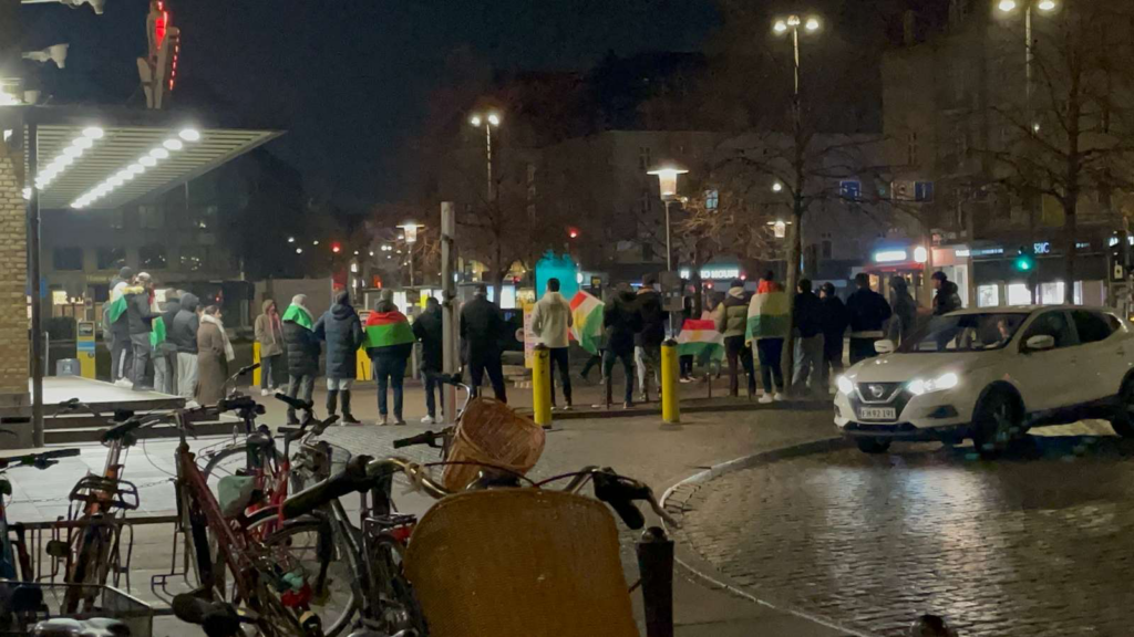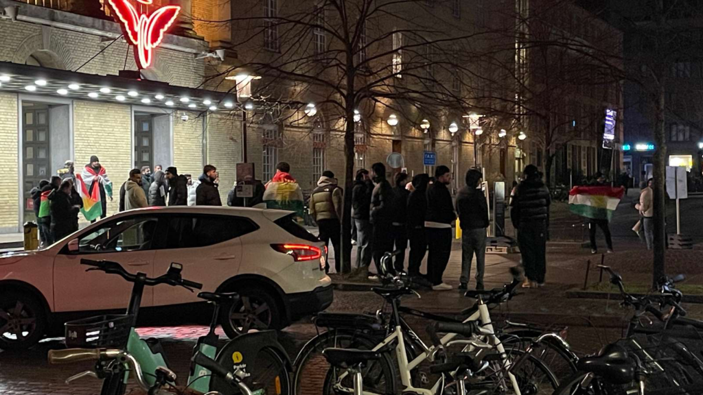 Flere demonstranter bærer det kurdiske flag og råber i flok på et andet sprog end dansk.
