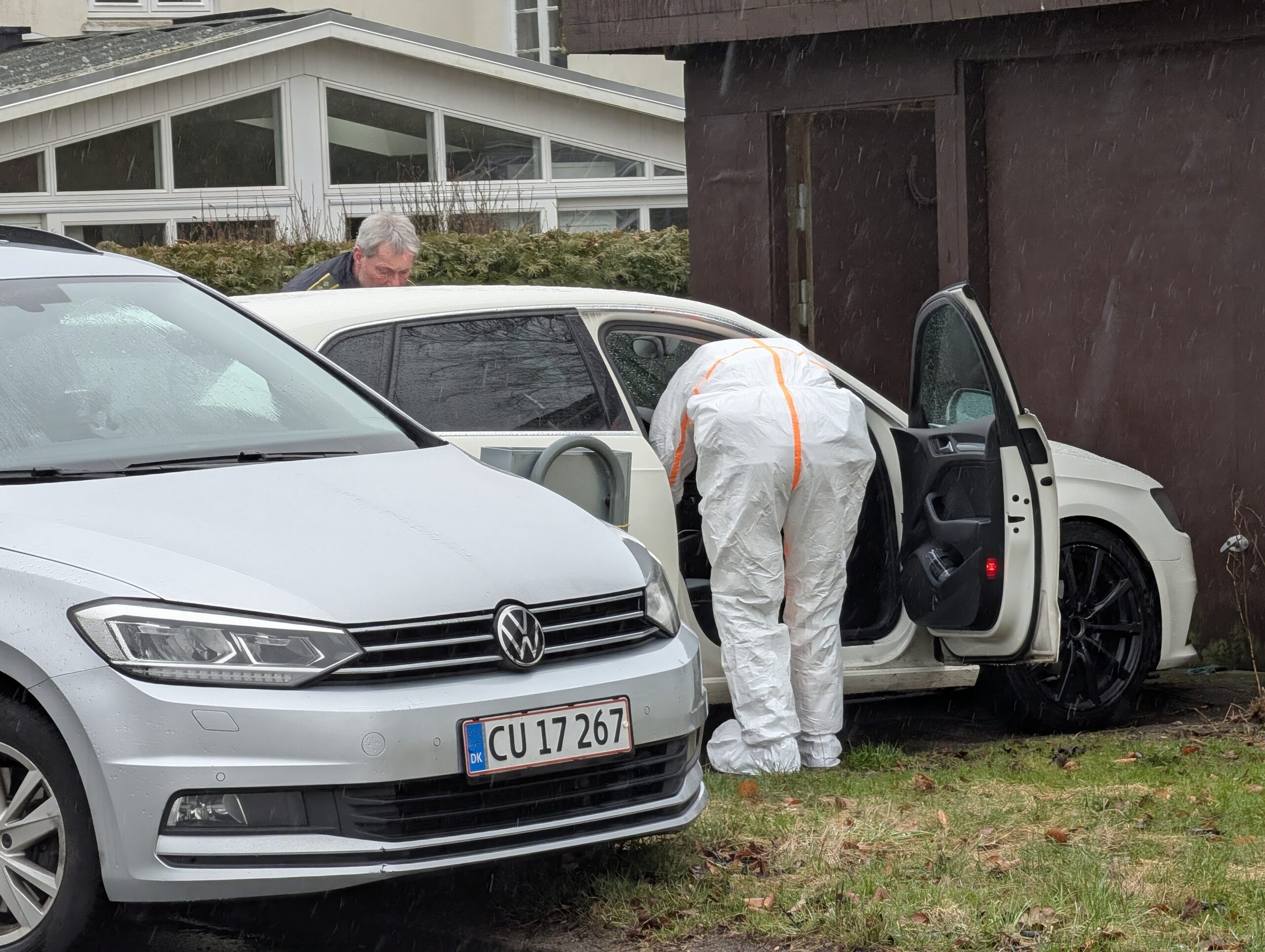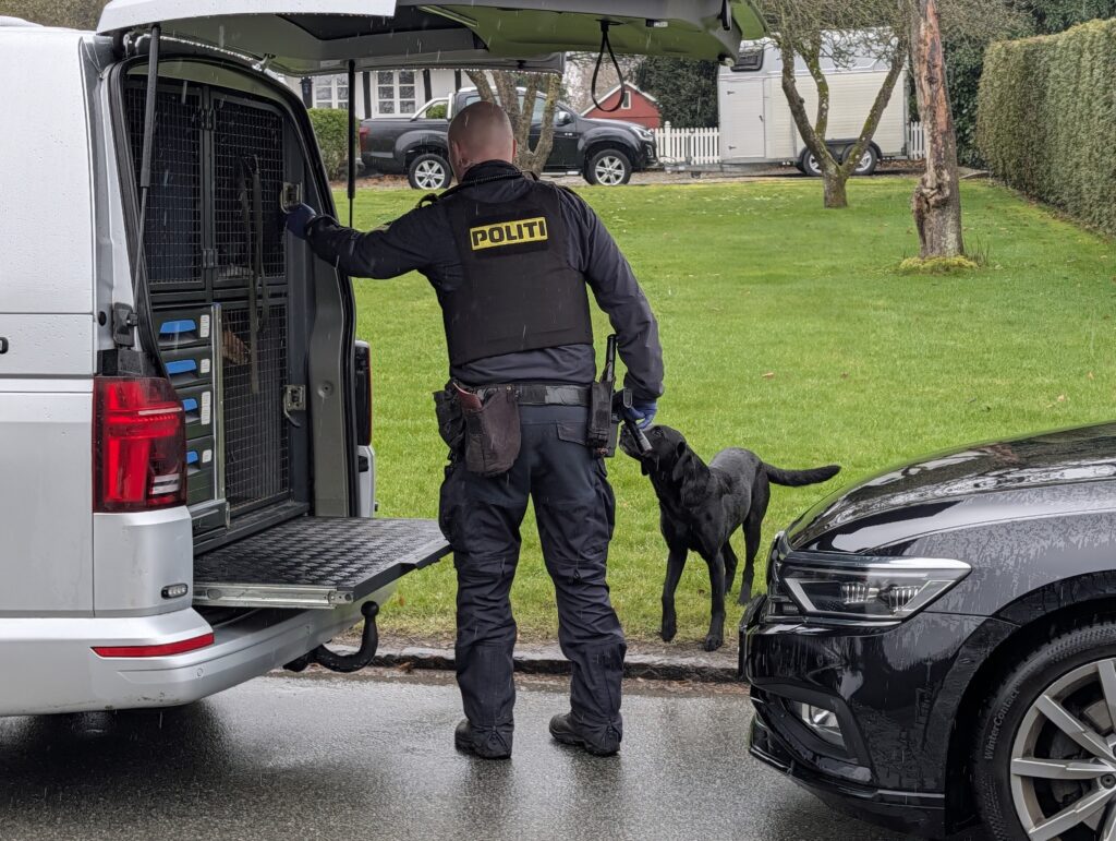 Presse-fotos.dks udsendte var på stedet ved den ene af adresserne, hvor politiet var mødt op med hunde og DNA-dragter. Her hentede de ting ud omkring et bil og et hus.