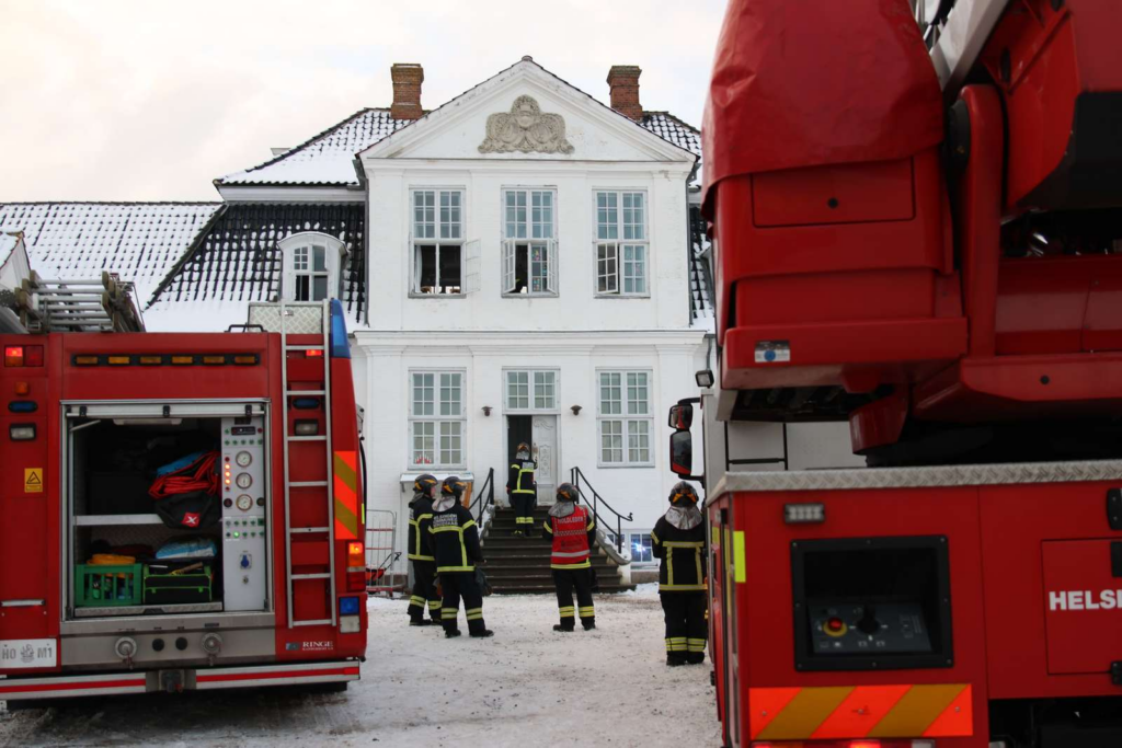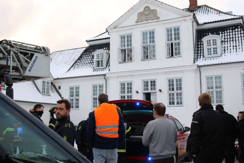 Flere udrykningskøretøjer er kørt ind i gården, hvor de holder, mens mandskabet arbejder.