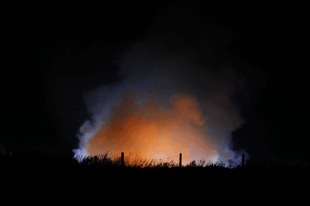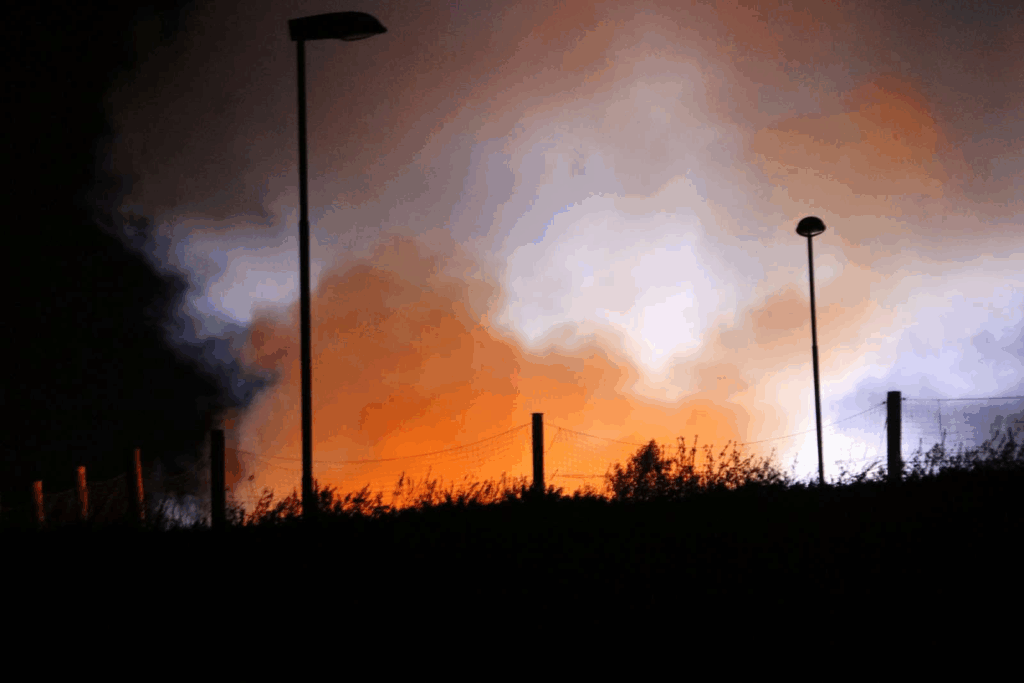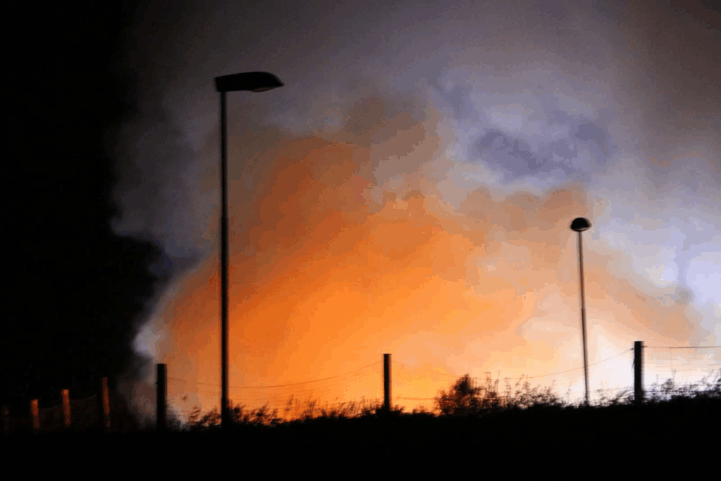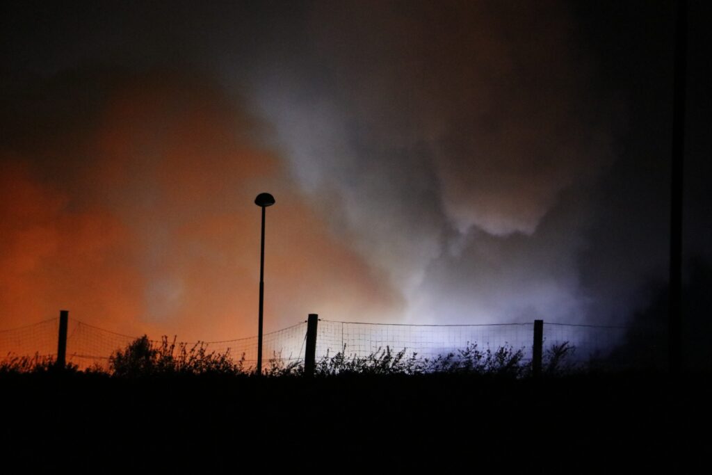 Ifølge Presse-fotos.dk’s udsendte på stedet kan en massiv røgsøjle ses på lang afstand, og flammerne står tydeligt op fra området.