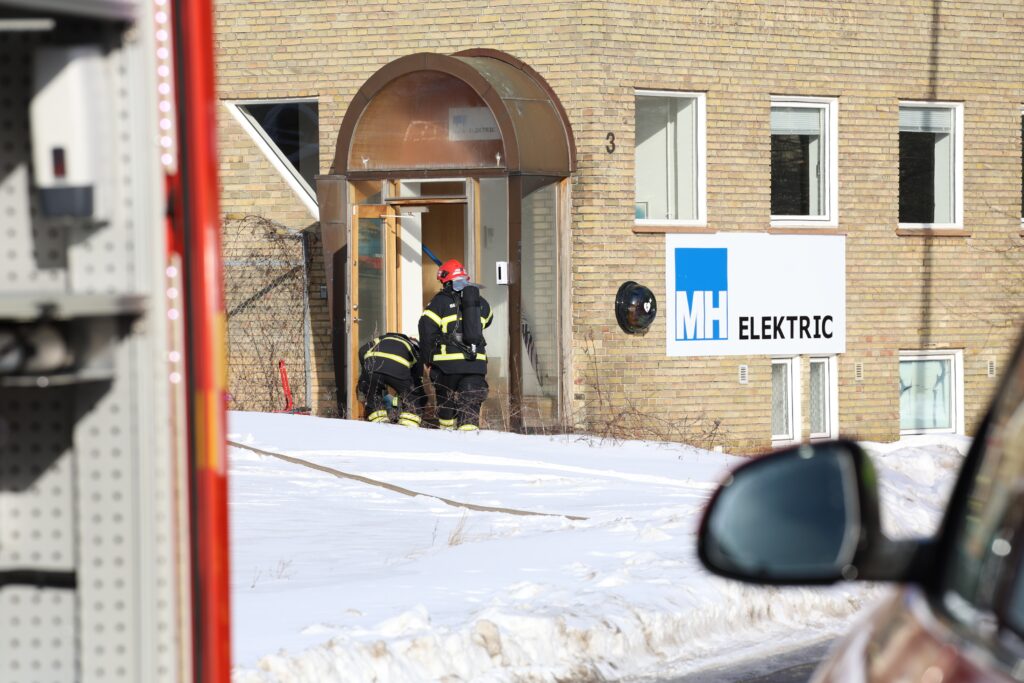 Her har man afspærret et større område omkring værsktedet, da der har været risiko for, at to gasflasker skulle sprænge i luften.