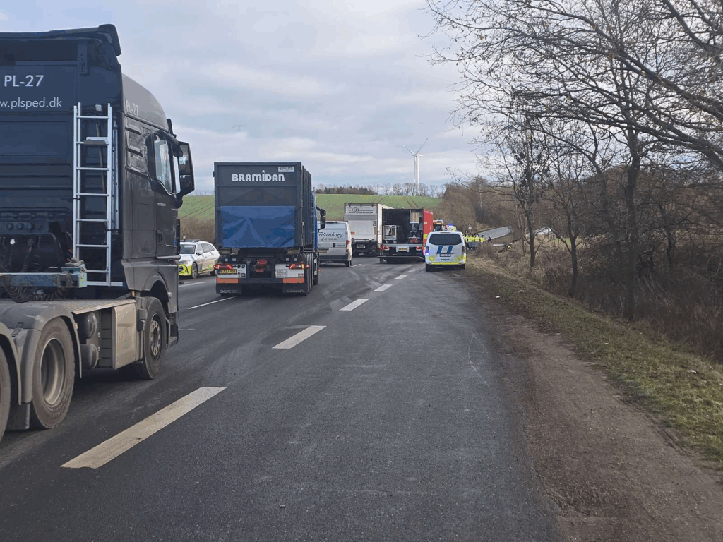 Det er voldsomme scener, der onsdag middag har udspillet sig på en travl strækning, der nu er helt spærret. I grøften ligger en lastbil.