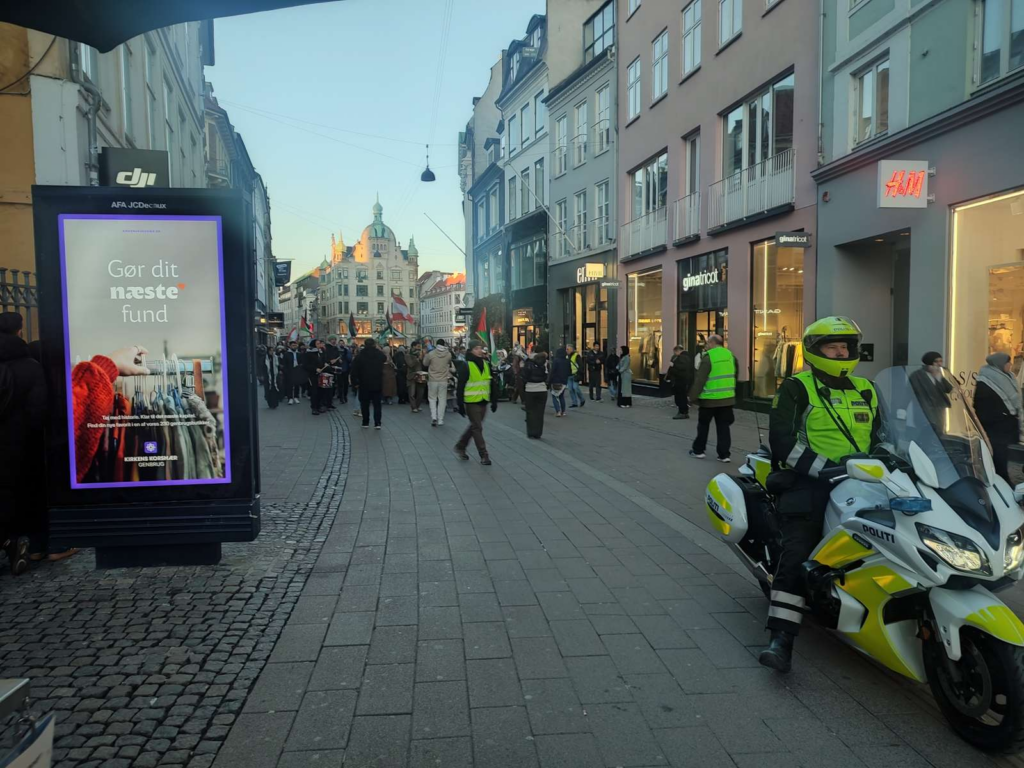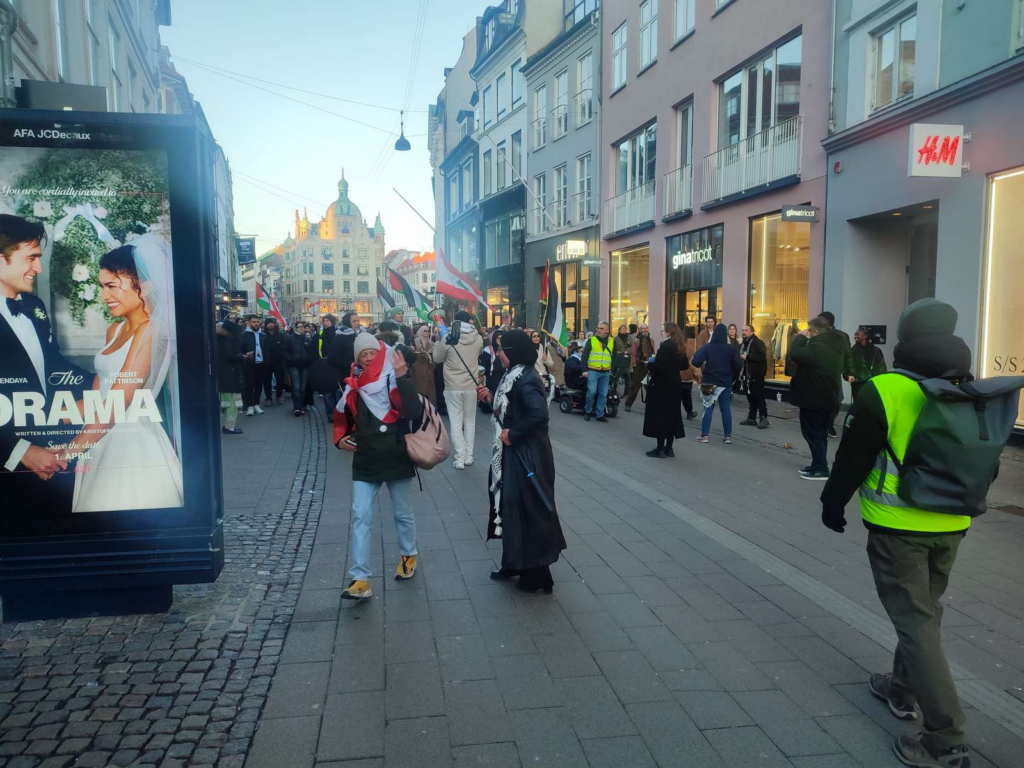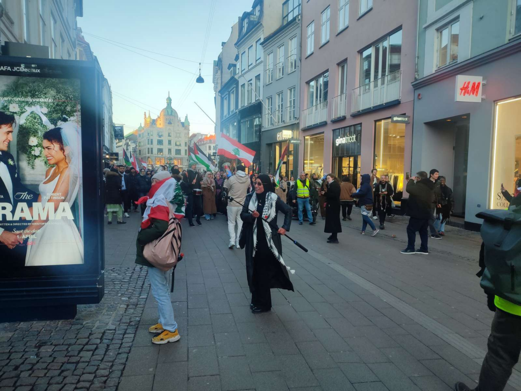 Optoget går gennem Strøget i København, hvor der bliver sunget slagsange og flaget med palæstinesiske og libanesiske flag.