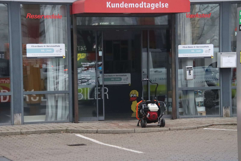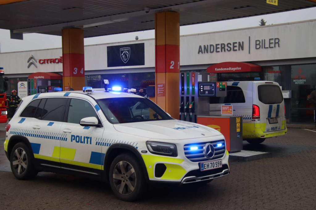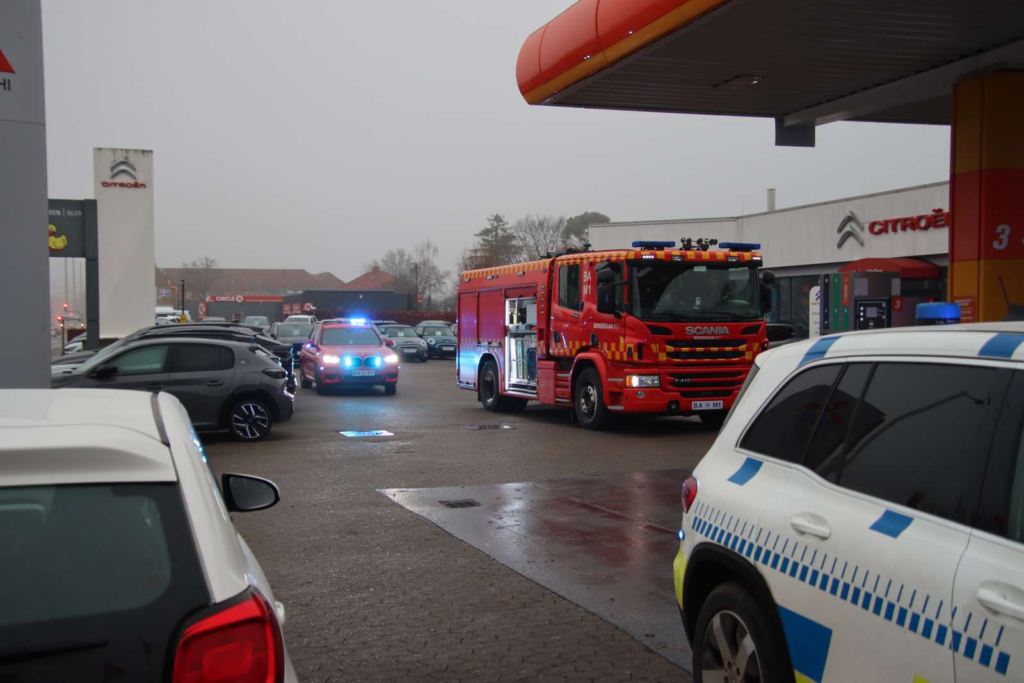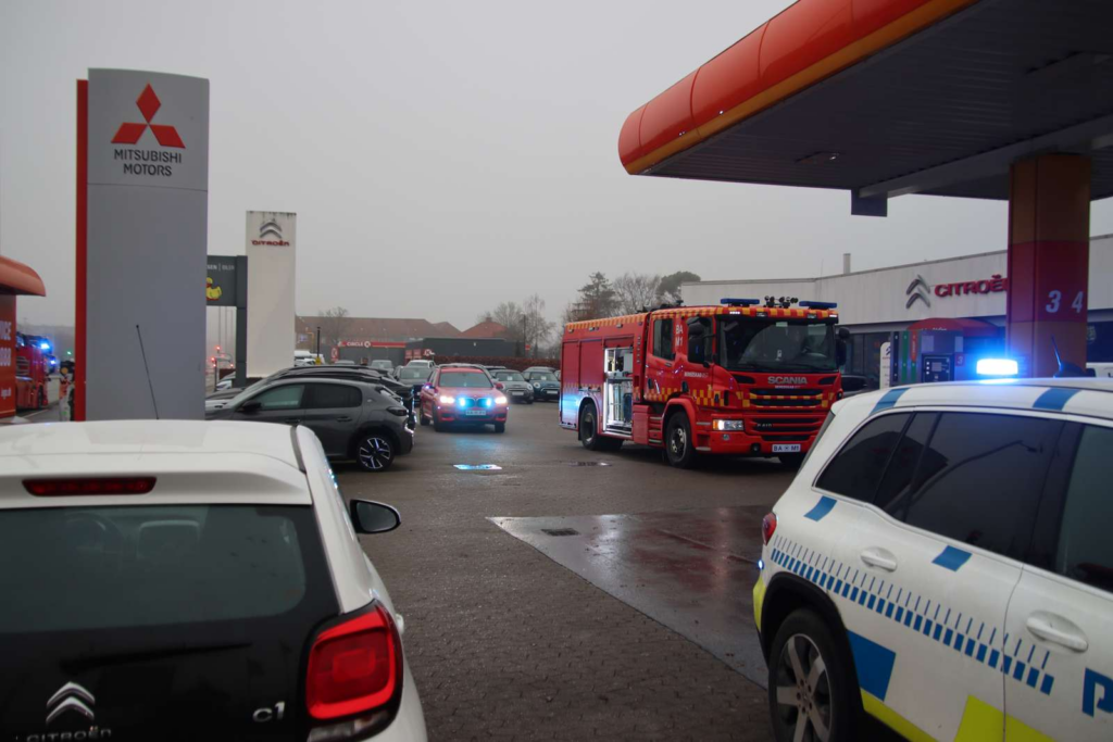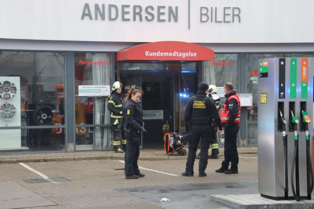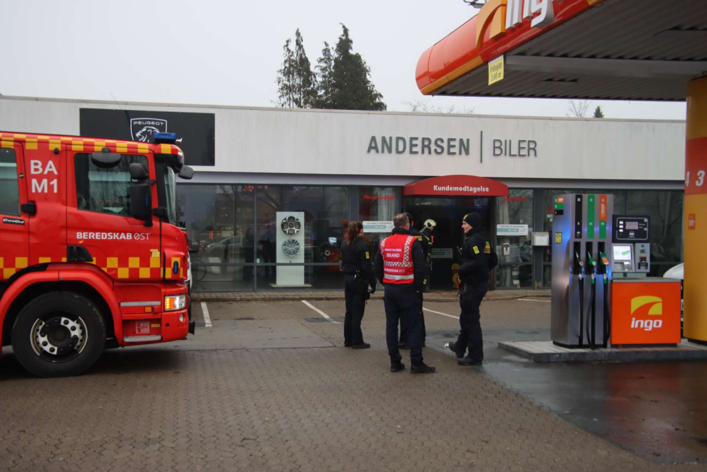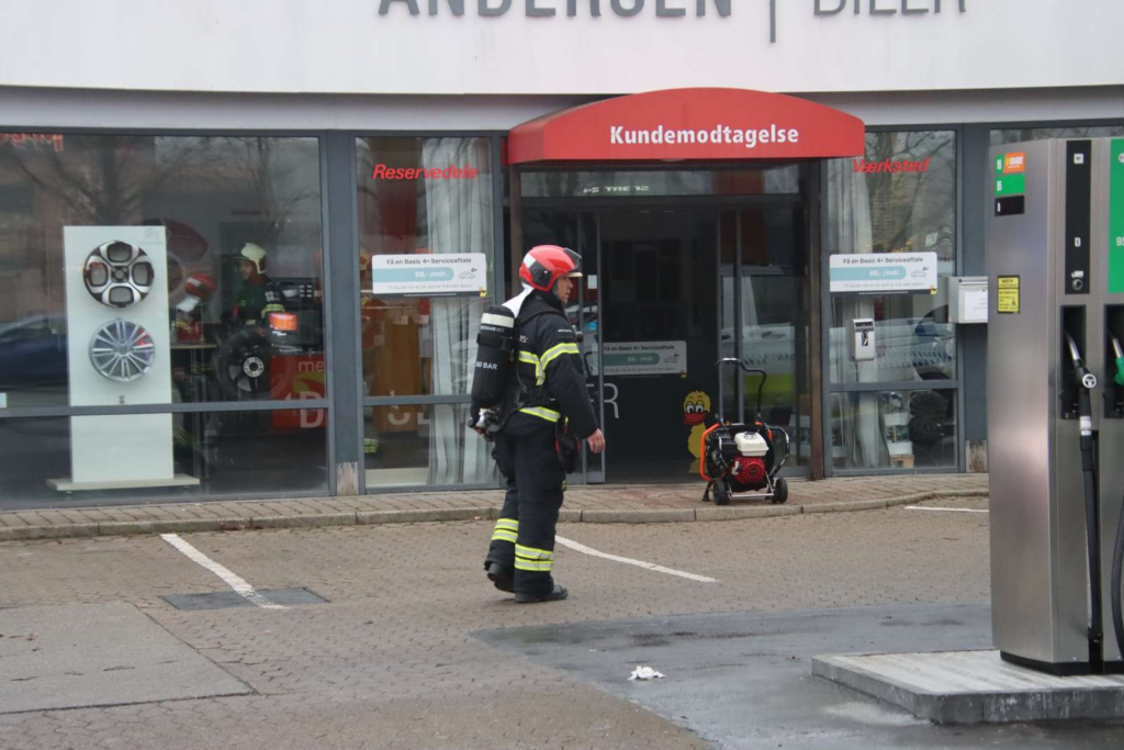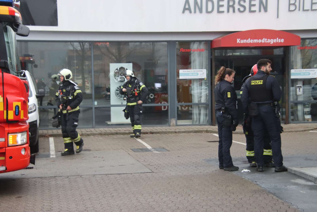 Flere udrykningskøretøjer holder lørdag eftermiddag foran en bilforhandler. Ikke fordi de er til salg, men fordi der er indgået en brandmelding fra stedet.