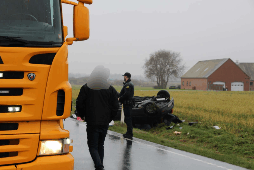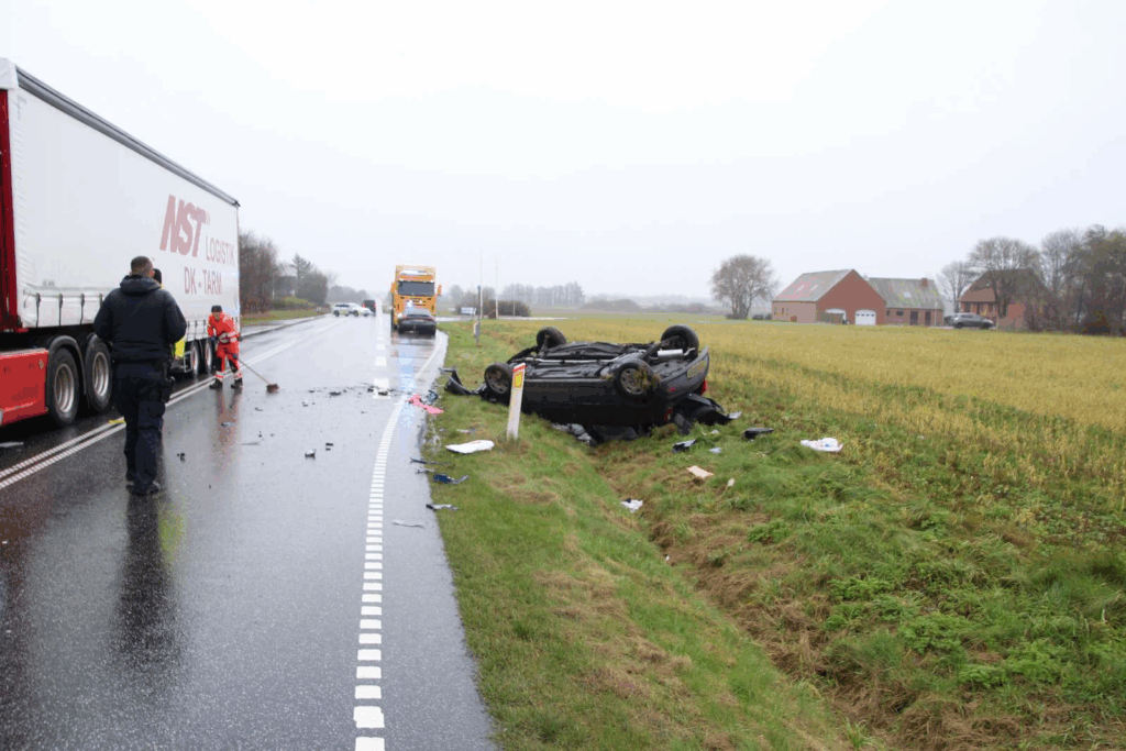 Billeder fra stedet viste i den forbindelse, at den forulykkede personbil var blevet kastet ud på en mark, hvor den lå smadret på taget.
