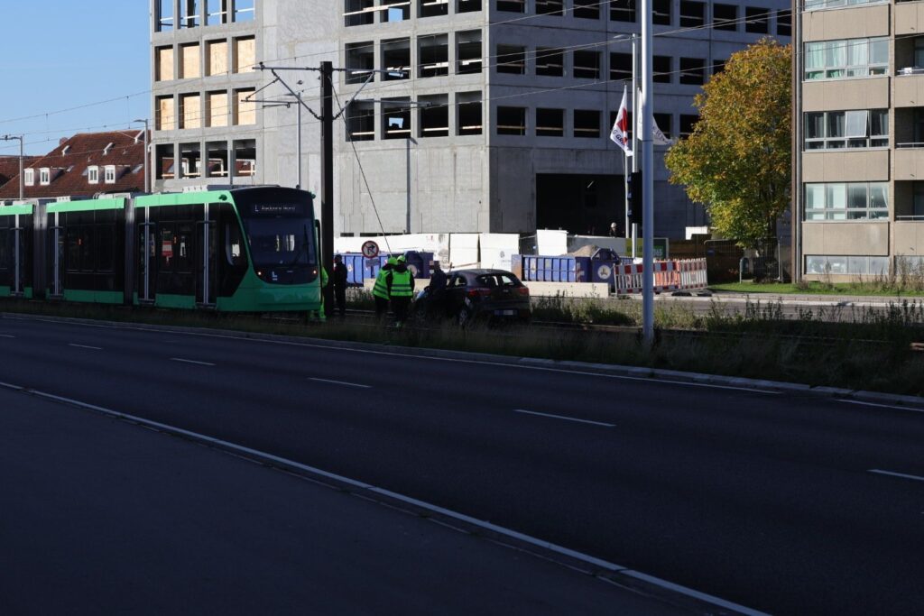 Politiet og flere medarbejdere fra Letbanen er nu fremme på stedet, hvor føreren af personbilen også står.