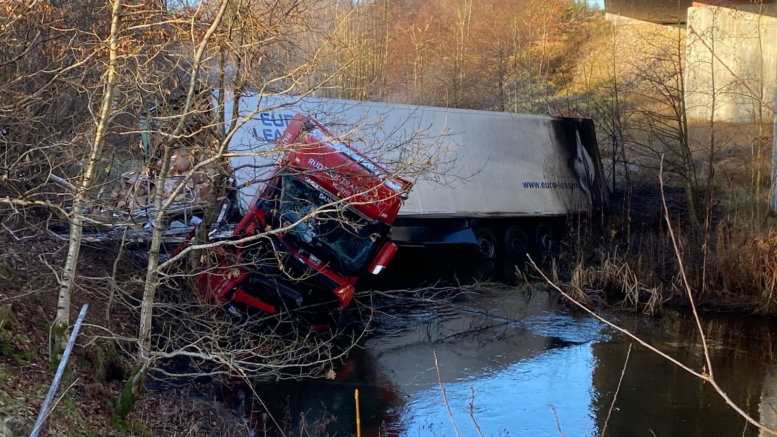 Lastbil ryger gennem autoværn og styrter ned i å
