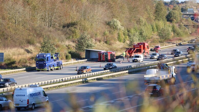 Lastbil væltet på motorvej: ‘Oprydning vil tage mange timer’