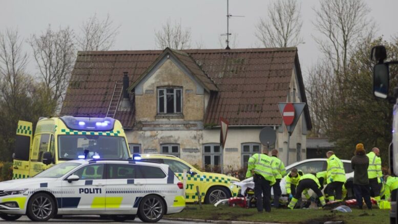 Mærsk-lastbil lastet med kød vælter i rundkørsel