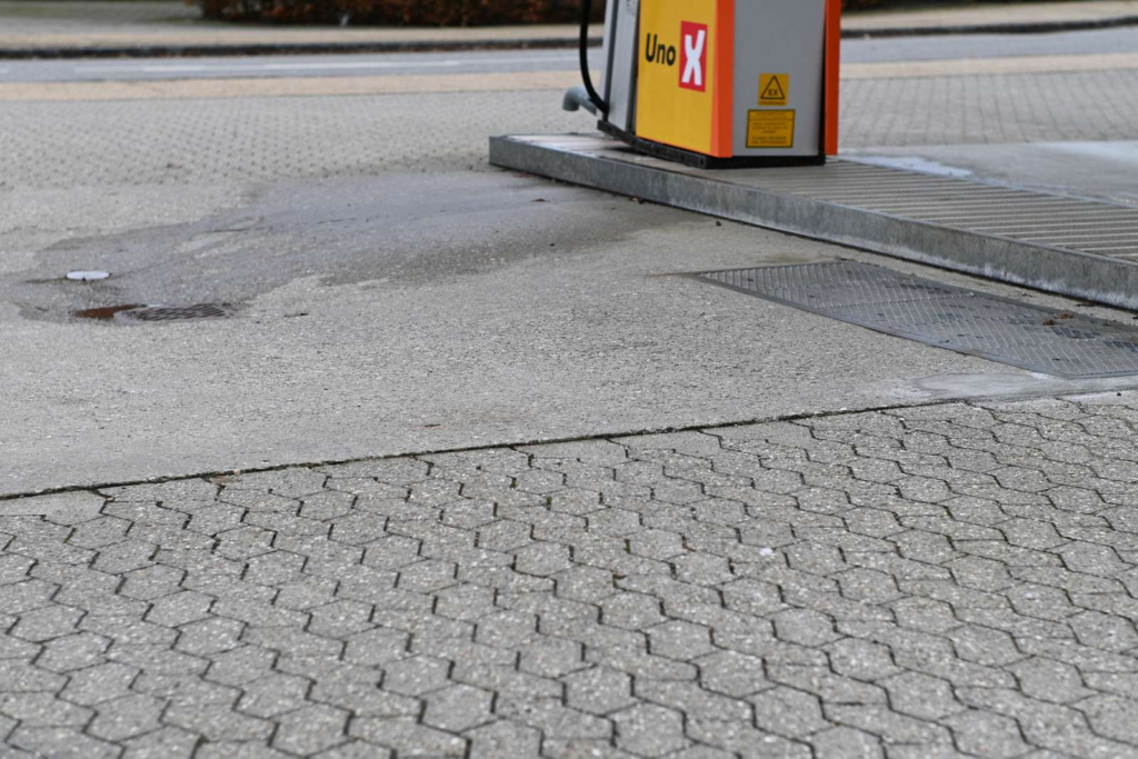 På underlaget under en af pumperne ses væske, der tilsyneladende enten er benzin eller diesel.