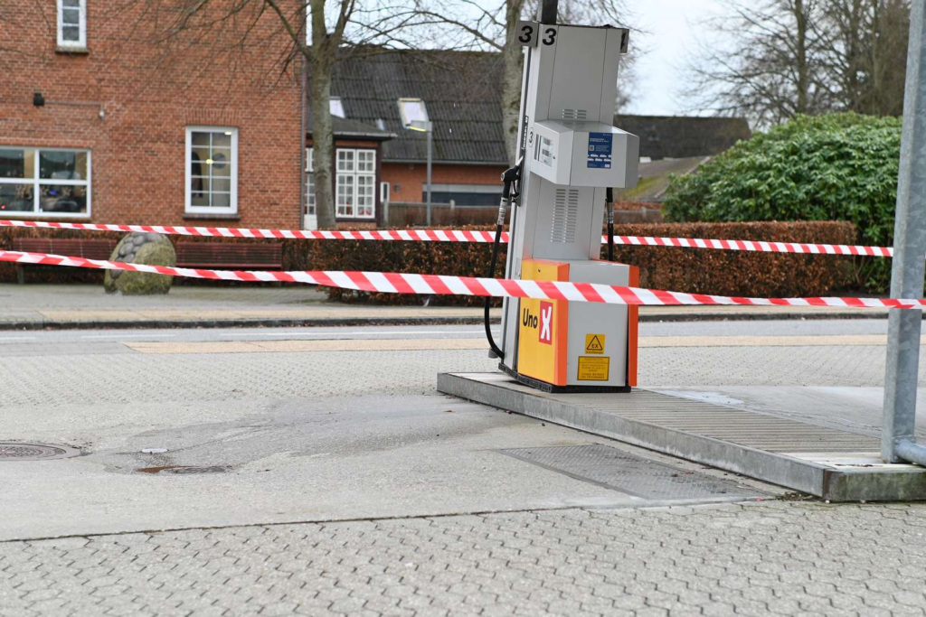 Billeder fra stedet viser, at overdækningen på tanken, der er monteret fast i jorden, står helt skævt, hvilket også har fået selve pumperne til at rykke sig.