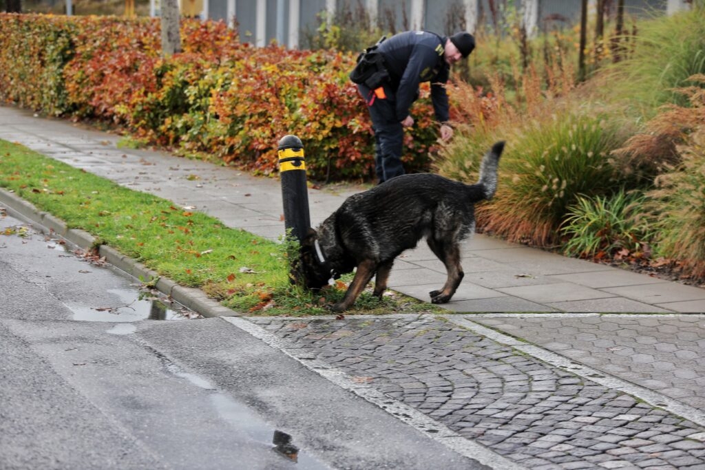 Her var ordensmagten til stede med flere patruljer, og området blev undersøgt med hunde. Samtidig blev en telefon fundet i en hæk og sikret i en bevispose.