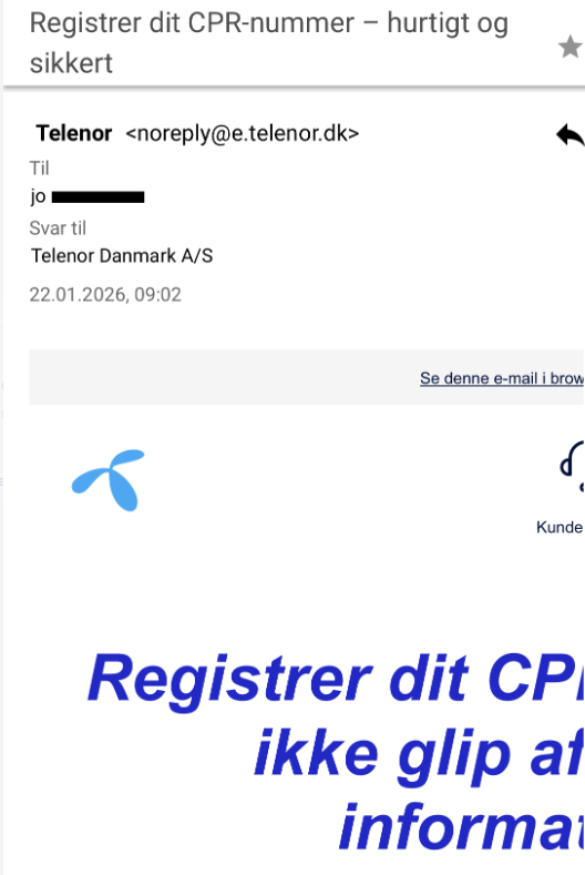 Ifølge Telenor bedes man som modtager af mailen registrere sine private CPR-oplysninger.