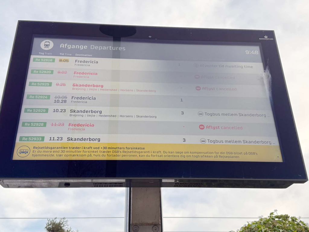 Det går ud over passagerer, der skulle med fra enten Brejning eller Børkop. Disse opfordres til at kontakte DSB’s kundeservice for at finde en løsning. Helt konkret strækningen mellem Fredericia og Skanderborg.