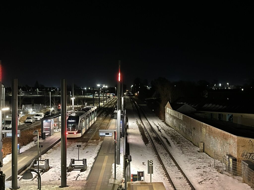 Politiet skulle ifølge Presse-fotos.dks udsendte være på stedet, men letbanen holder stille inden Hjallese.