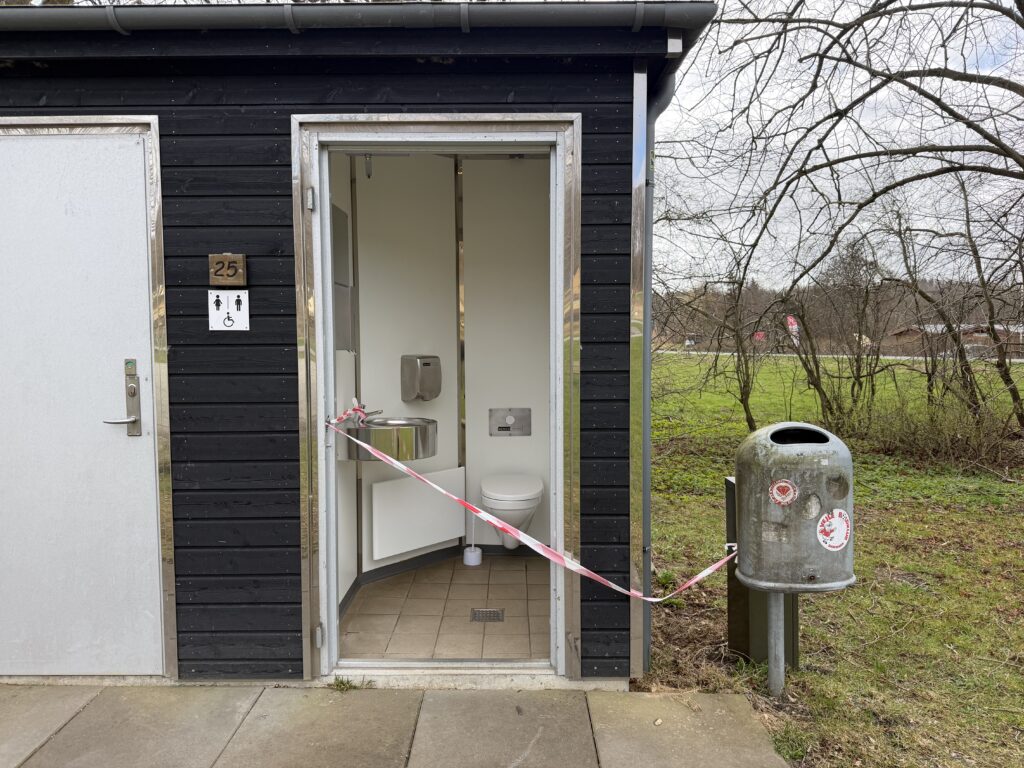 Herefter er toilettet blevet spærret af, da døren er hægtet af – og sandsynligvis for at sikre sig mod flere uheldige toiletsituationer.