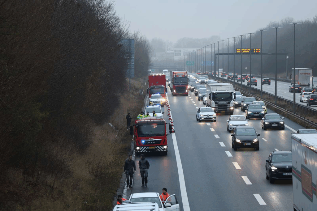 Flere køretøjer holder i nødsporet, mens udrykningsblink og advarselslys præger strækningen.
