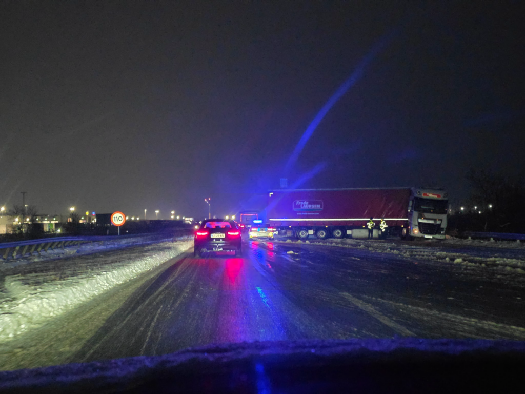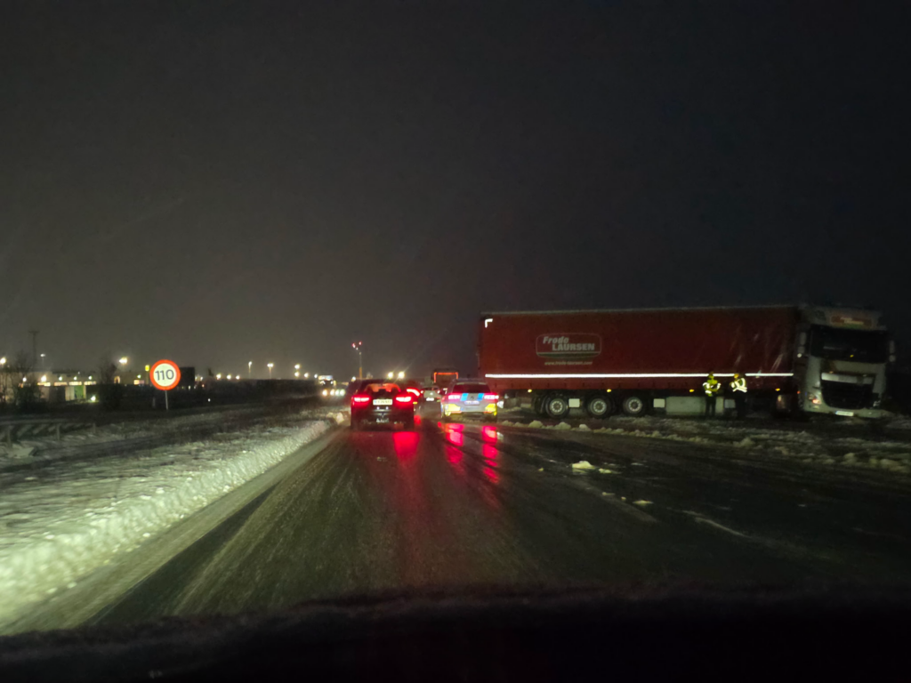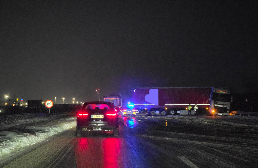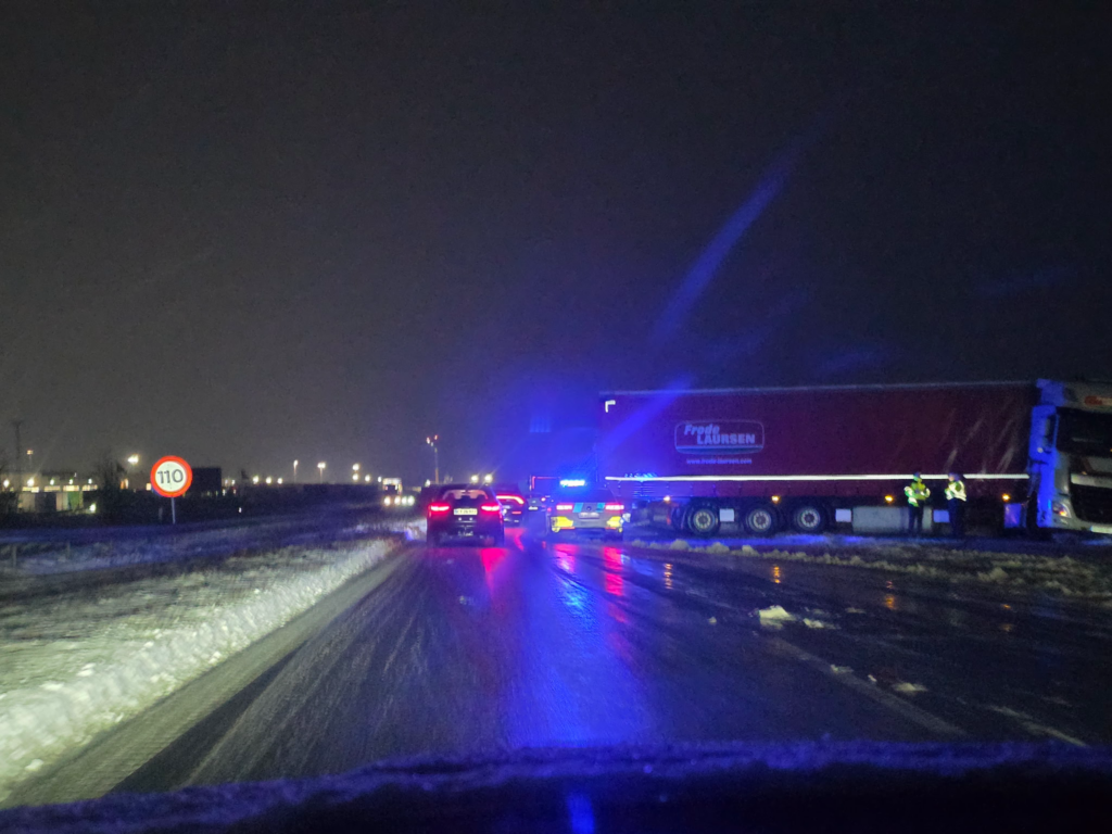 Billeder fra stedet viser, at lastbilen holder på tværs af vejen.