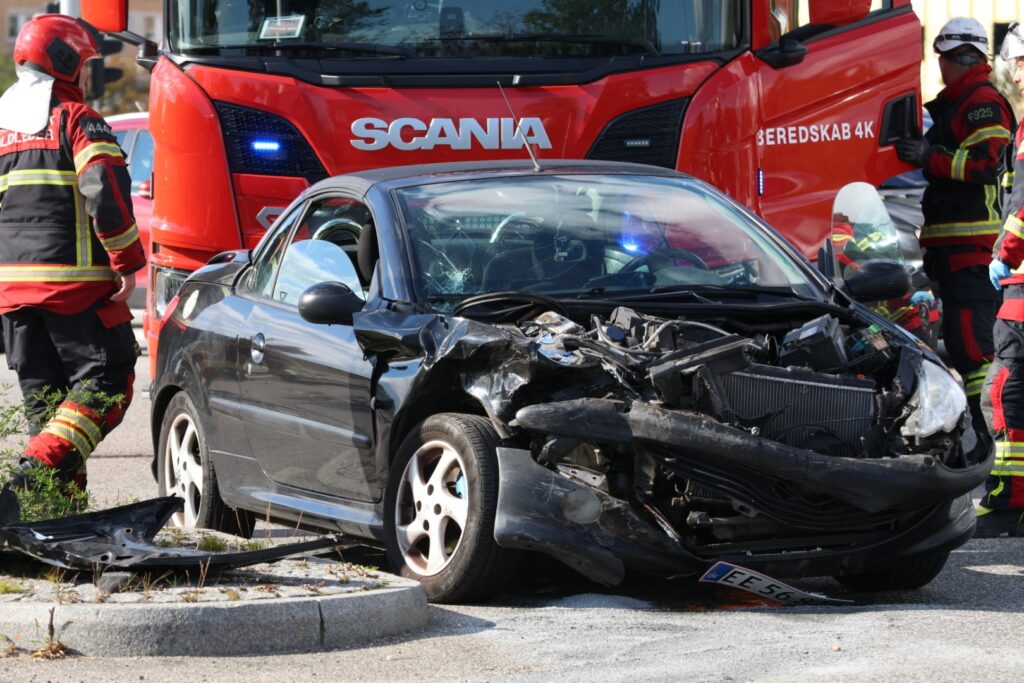 Uheldet fandt sted på Hveen Boulevard, tæt ved indgangen til centret, hvor en personbil nu holder med kraftigt smadret front. Bilen står stille midt på kørebanen, og store dele af fronten er trykket helt ind, hvilket tyder på et kraftigt sammenstød – muligvis med et fast objekt eller en anden bil.
