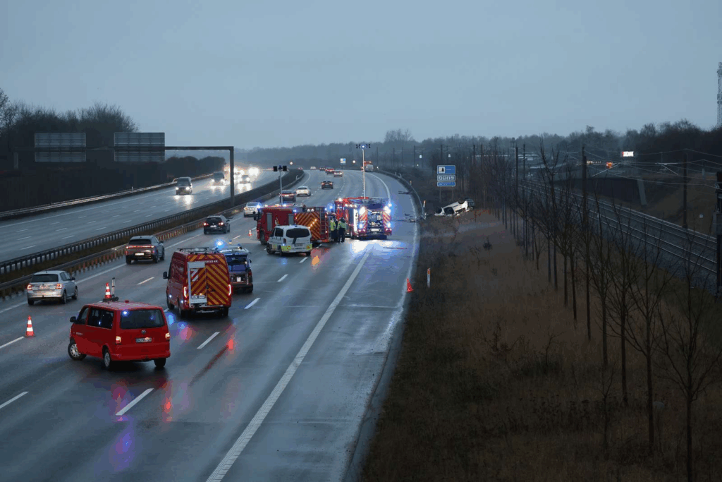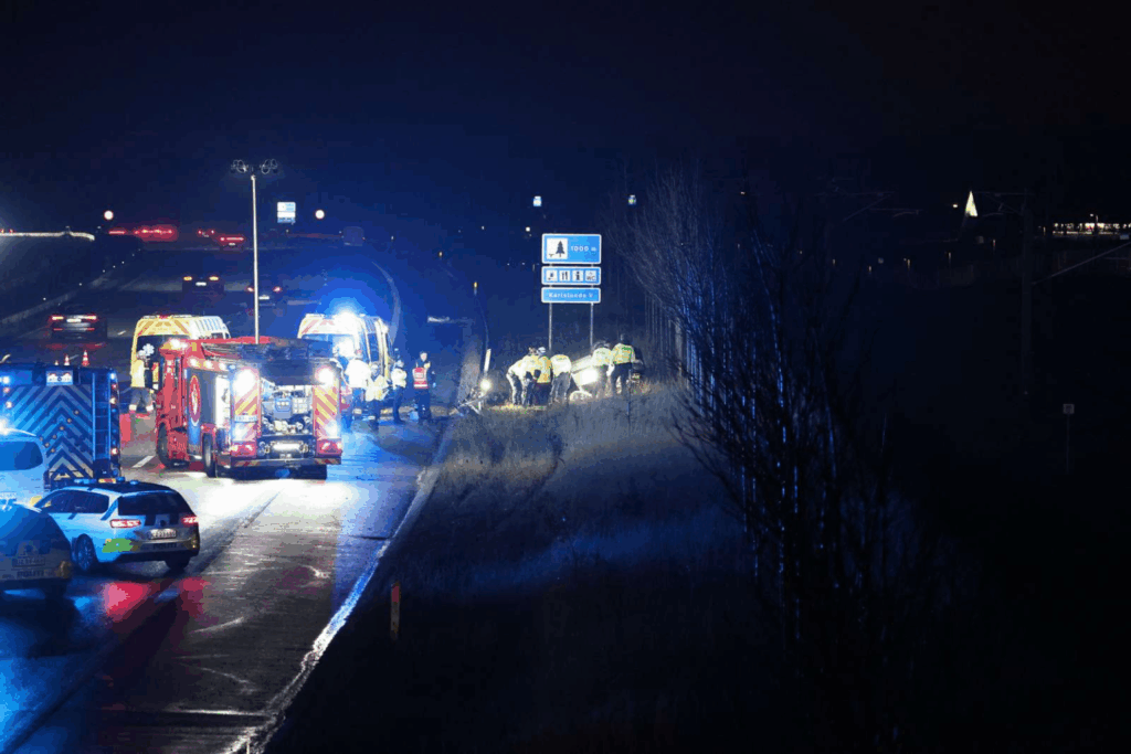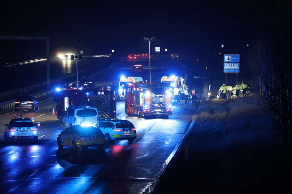 ’Motorvejen er helt spærret, og der bliver taget dronebilleder,’ fortæller Presse-fotos.dks fotograf fra stedet og beskriver en redningsindsats af ekstraordinær størrelse.