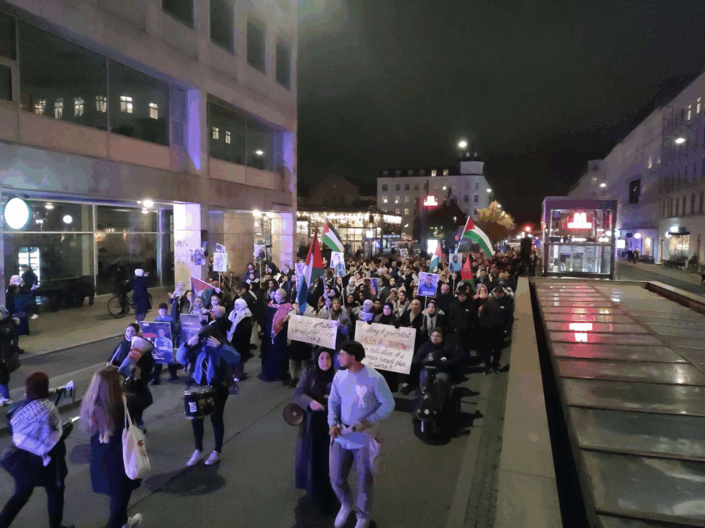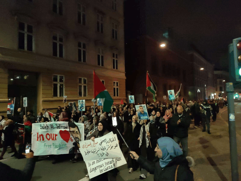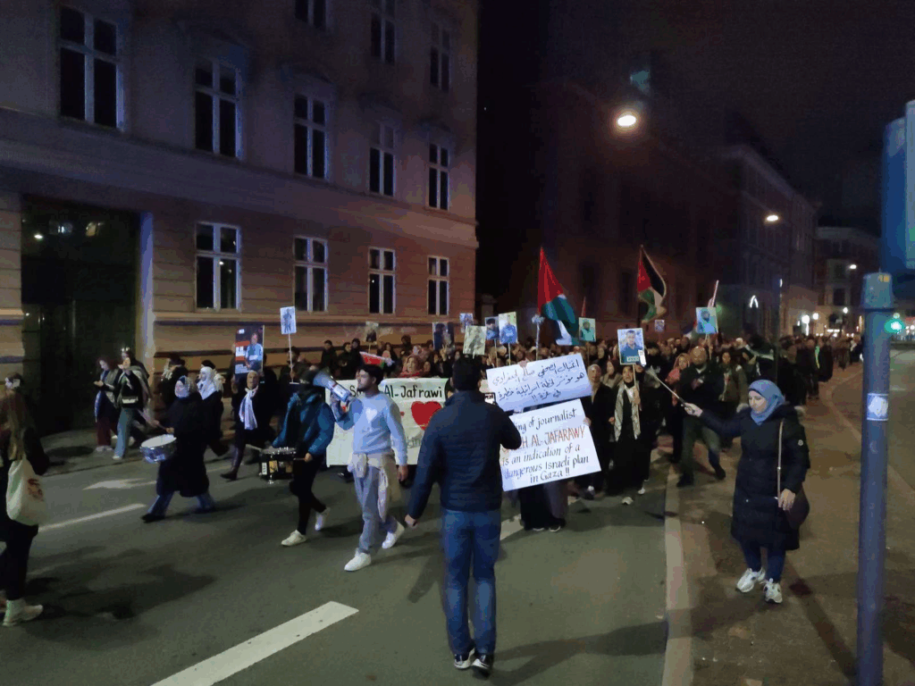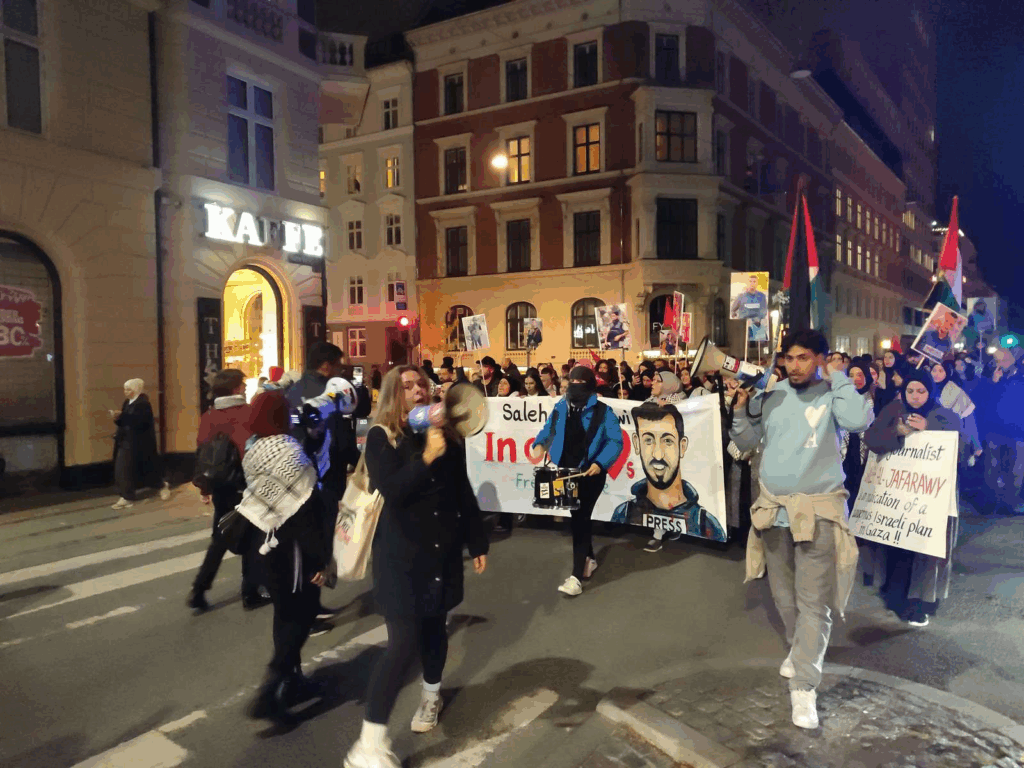 Forrest i mængden af demonstranter ses et stort banner, hvorpå den palestinensiske journalist Saleh al-Jafarawy er afbilledet.