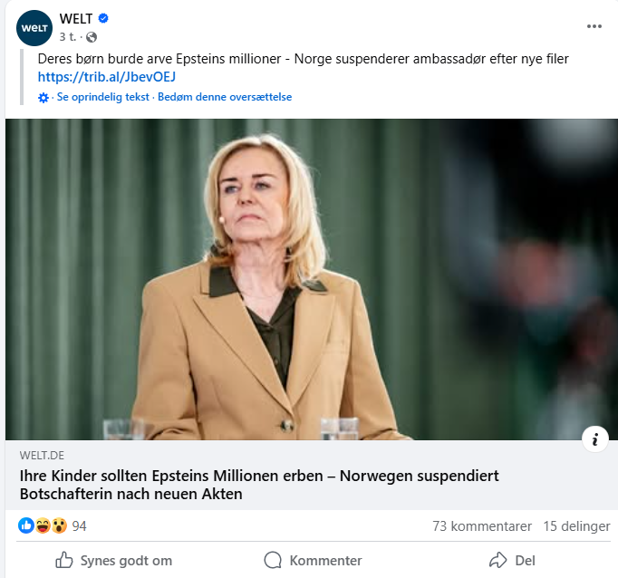 Navneforvirringen har ført til en uheldig fejl i et tysk medie. Mens mediet Welt har skrevet en artikel om den norske Mona Juul, har de i delingen på Facebook og X brugt et billede af den danske Mona Juul.