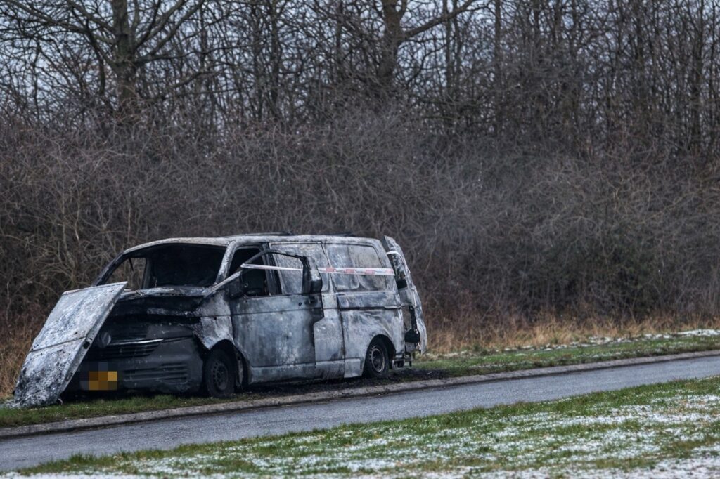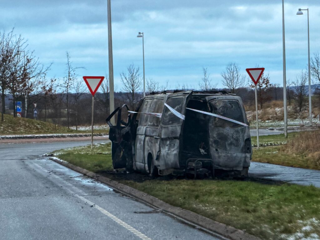 Tirsdag formiddag står den udbrændt varevogn nu tilbage i siden af Egeskovvej i Fredericia.