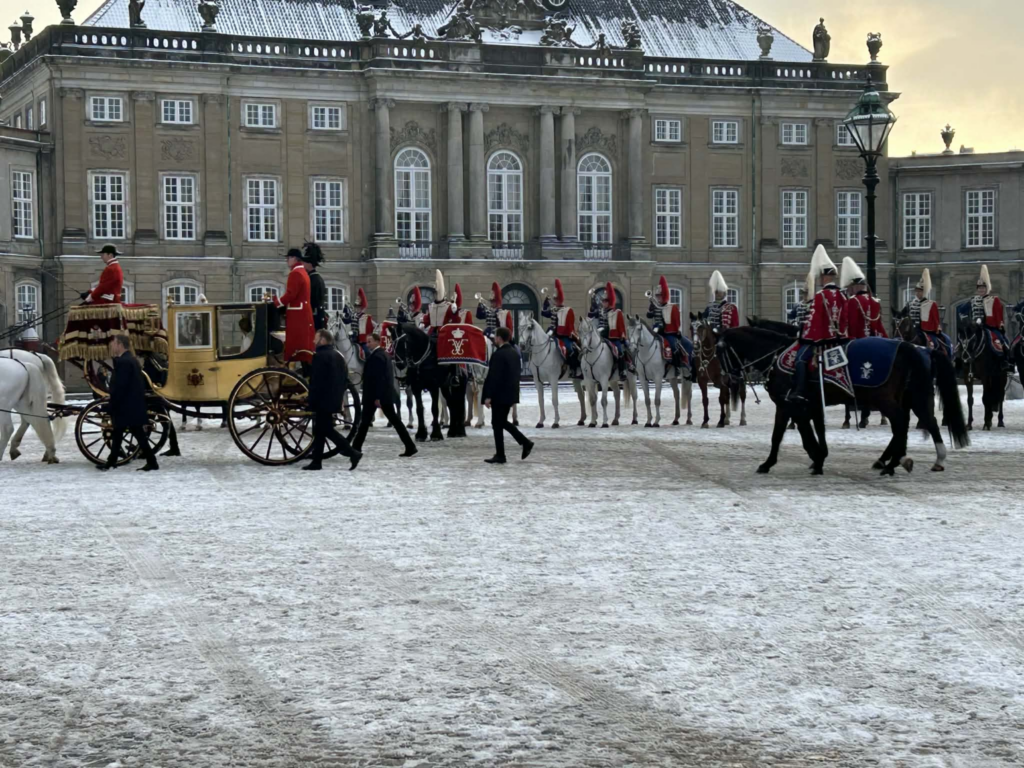 Her ankommer kongen og dronningen i deres guldkaret til Amalienborg Slot.