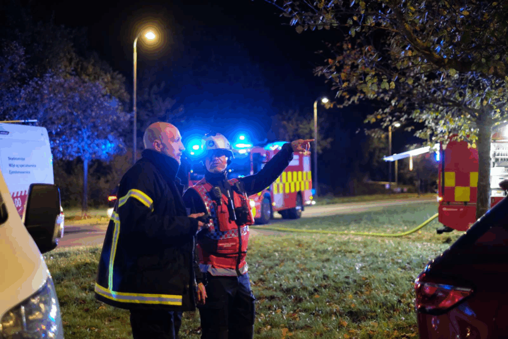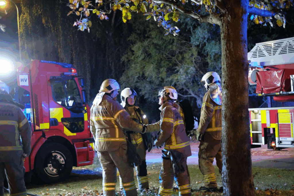 Blå blink fra mange udrykningskøretøjer lyser torsdag aften mørket op i et parcelshuskvarter, efter en brandmelding fra området.