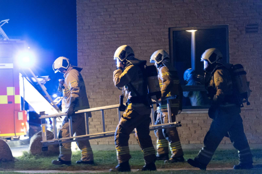 Flere udrykningskøretøjer holdte på stedet, hvor brandfolk arbejdede intensivt inde i bygningen.
