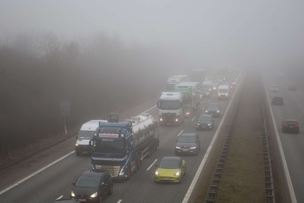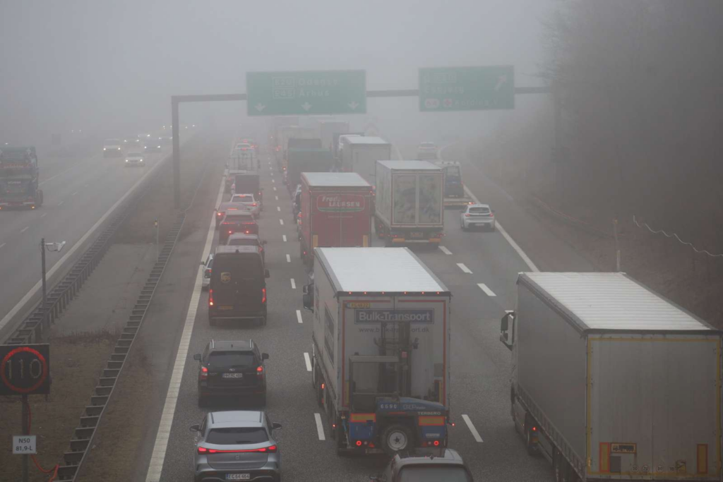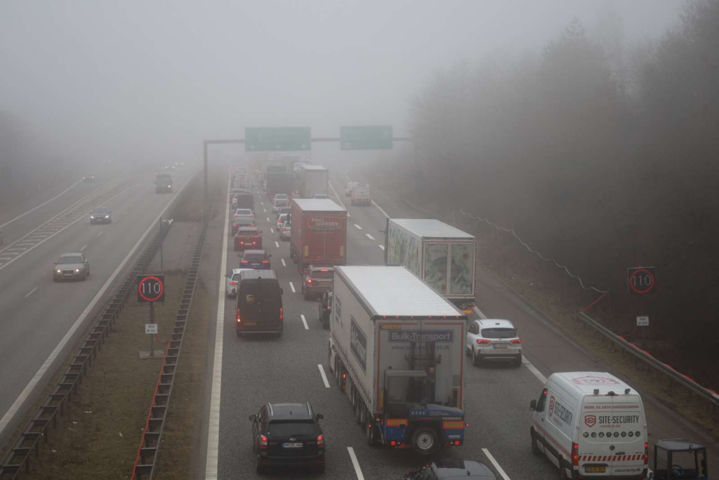 Ifølge trafikinformationen drejer det sig om E45 Sønderjyske Motorvej fra Kolding mod Skærup mellem afkørsel 64 Kolding V og afkørsel 63 Bramdrupdam.