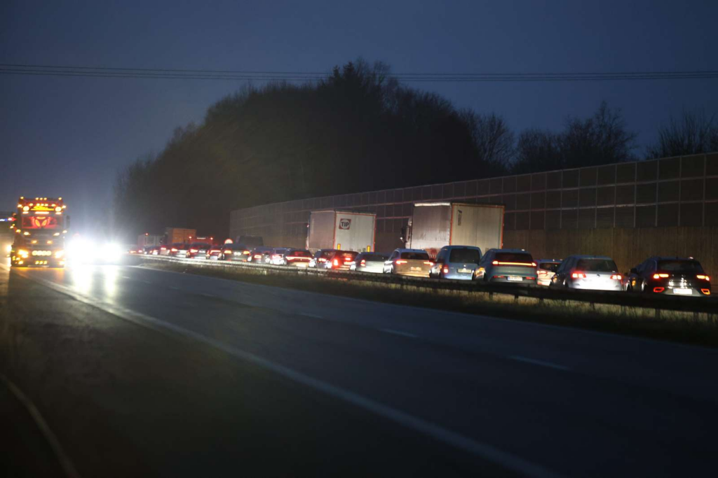 Trafikken står næsten stille, mens bilister bremser hårdt op og redningskøretøjer arbejder sig frem gennem tætte køer.