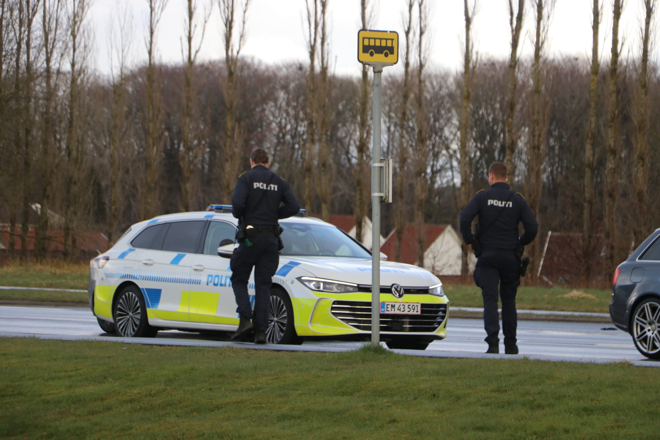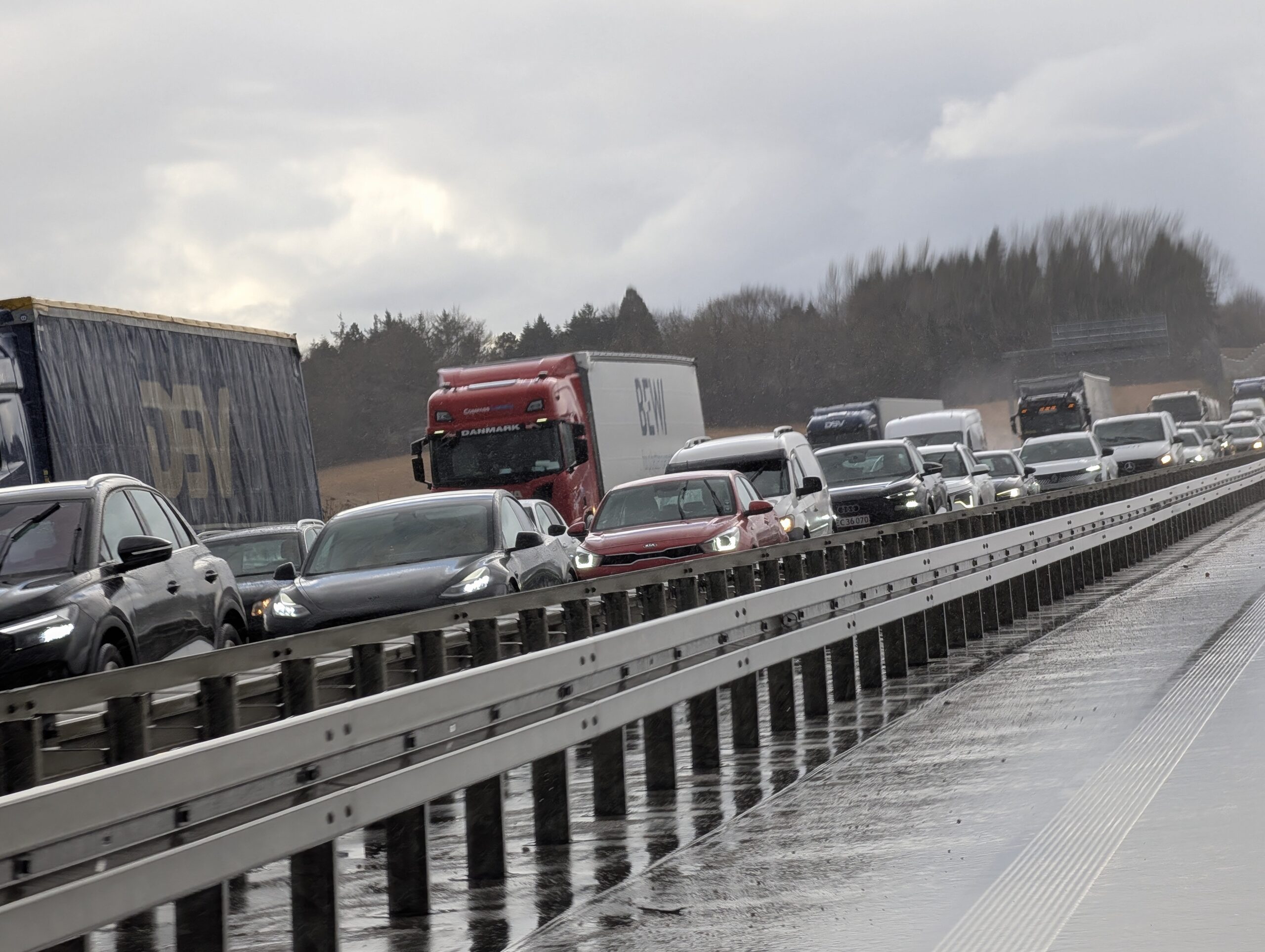 Billeder fra Presse-fotos.dks udsendte viser en bil, der holder på tværs af motorvejen og spærrer trafik.