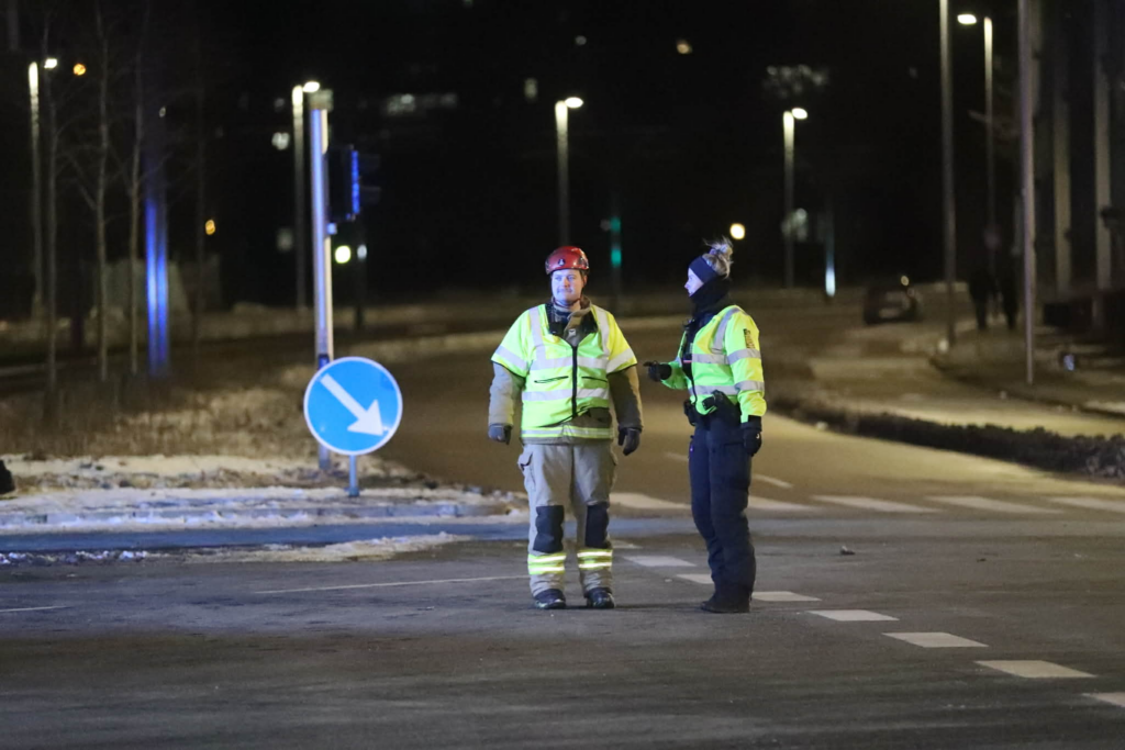Politiet regulerer trafikken manuelt for at sikre fremkommelighed og sikkerhed i området.