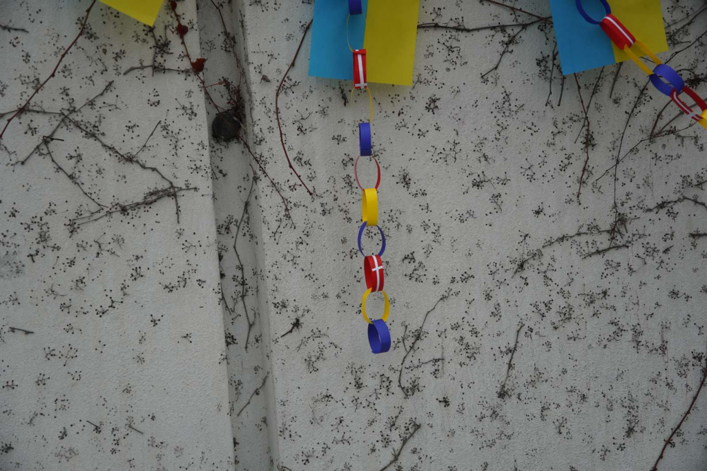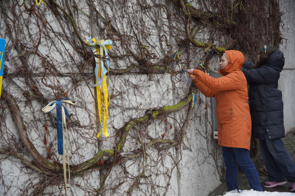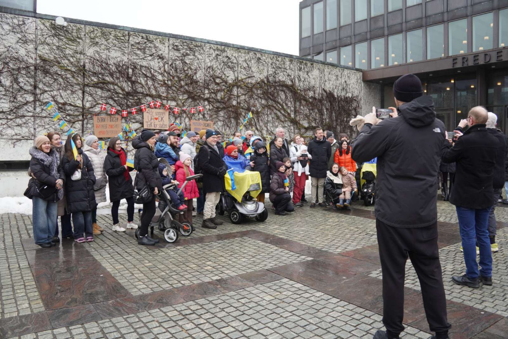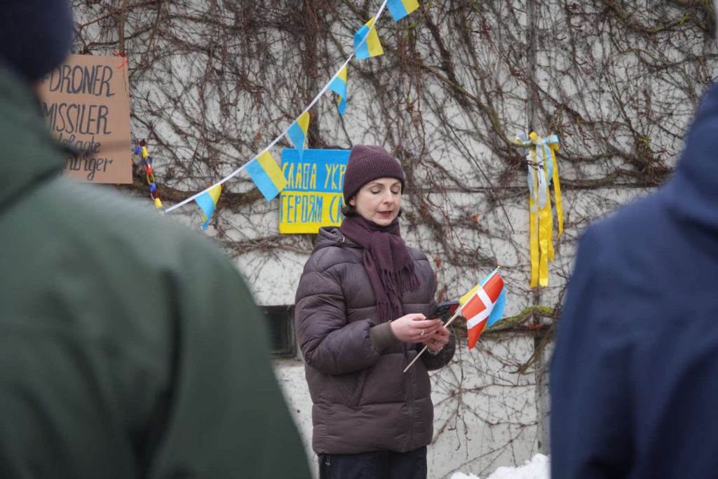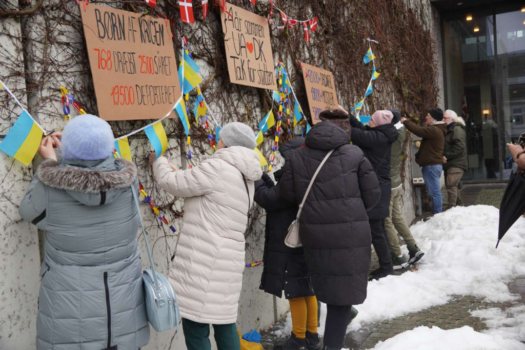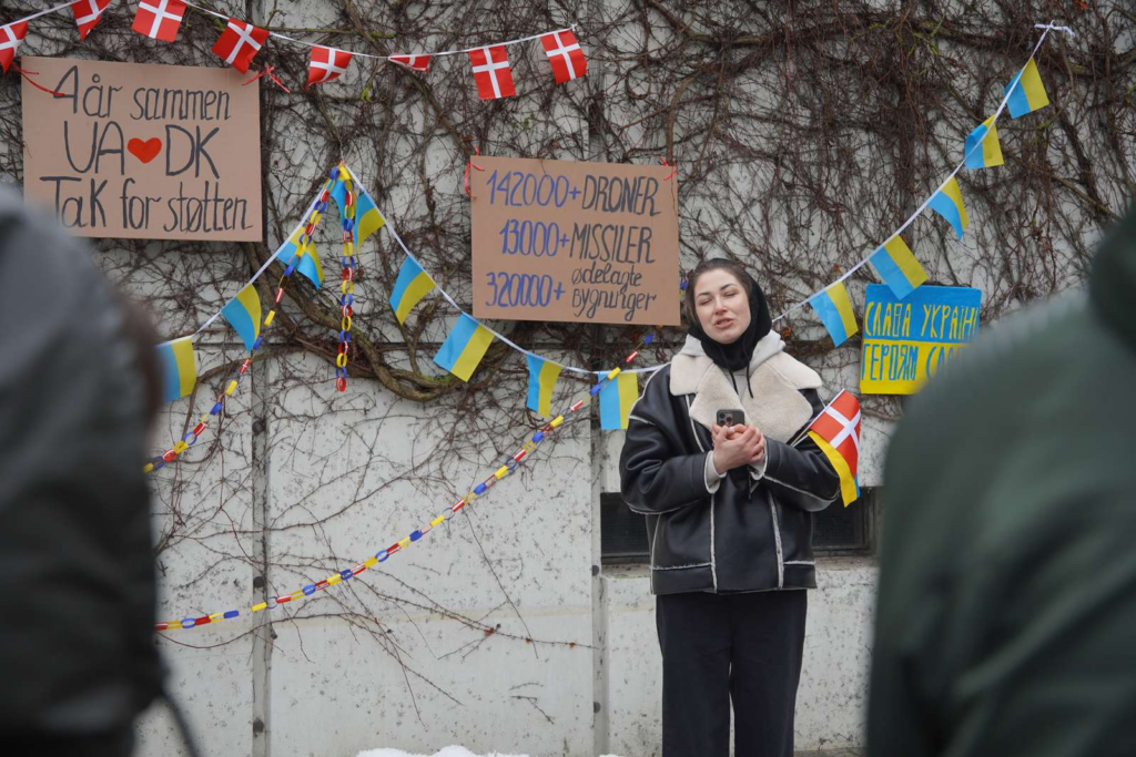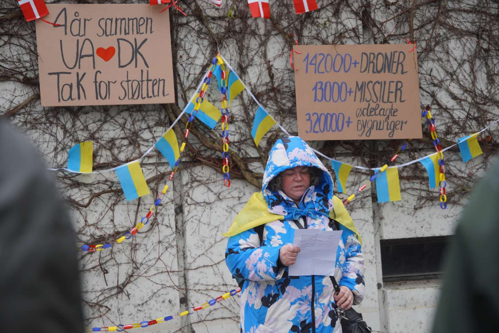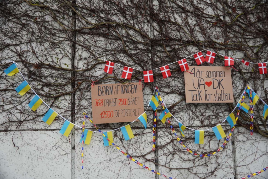 Blandt andet fremgår der skilte, hvor der står ‘Fire år sammen. Ukraine <3 Danmark. Tak for støtten.’