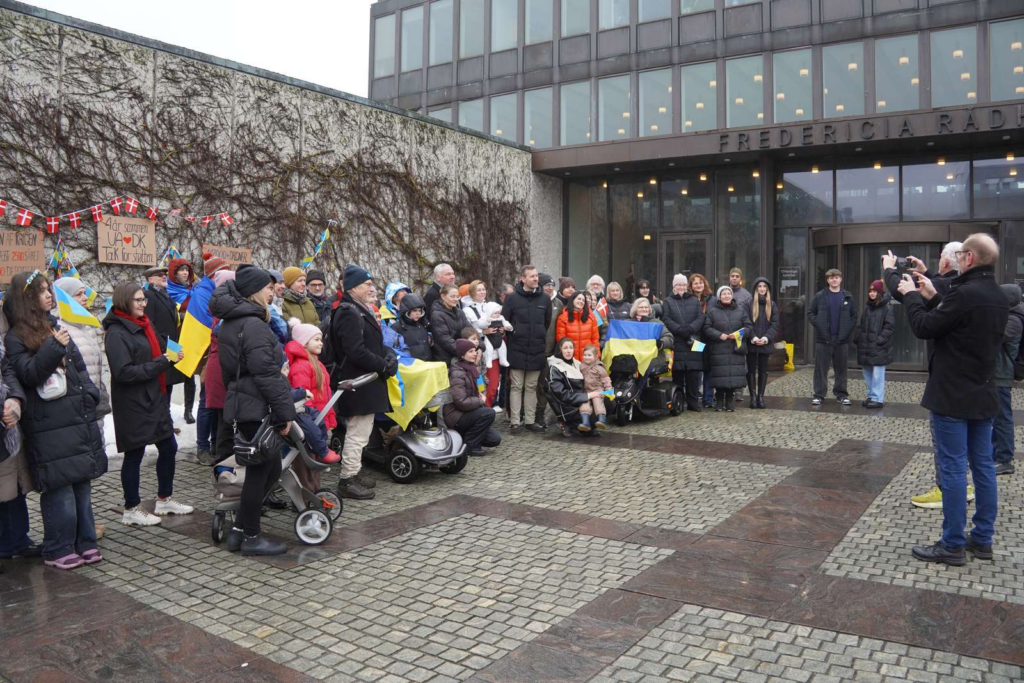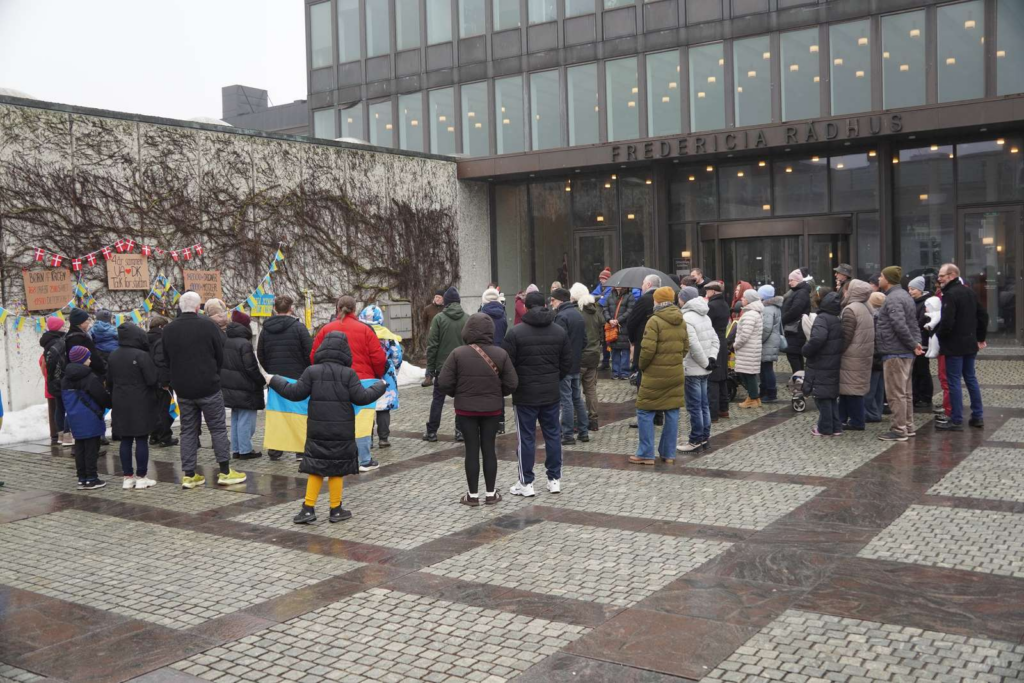Søndag formiddag har en række mennesker samlet sig foran Fredericia Rådhus til mindehøjtidelighed for Ukraine.
