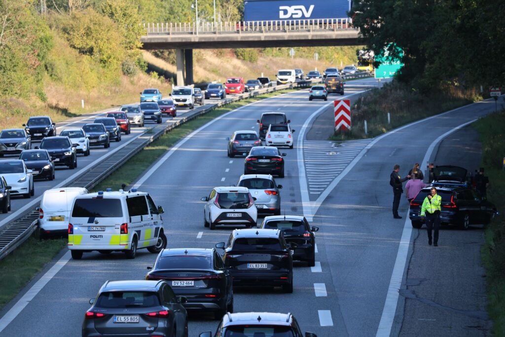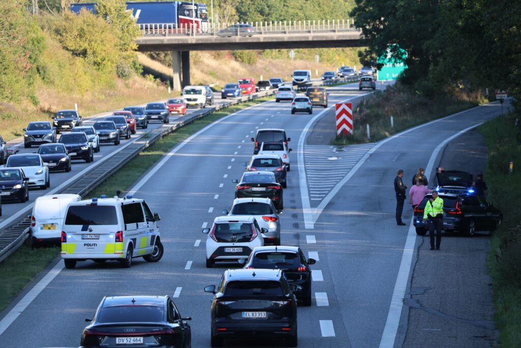 Politi og redning er fremme ved ulykkesstedet, hvor et spor er blevet afspærret, mens der arbejdes på stedet. I den anden side af vejen holder en autoværn, der umiddelbart er kørt ind i autoværnet.