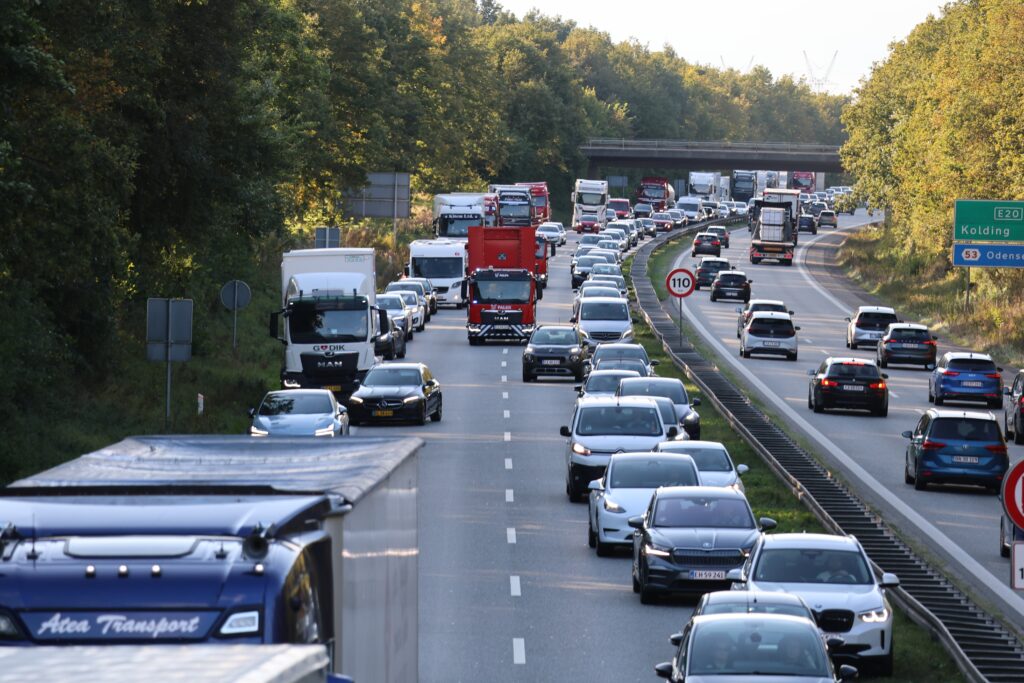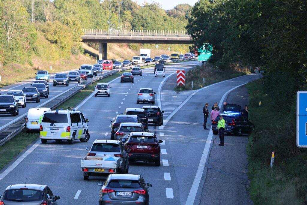Ulykken er sket på E20 Motorvejen på Fyn mellem Odense SV og Odense V. I den modsatgående retning er der også begyndende kø, da bilister sænker farten for at kigge på ulykken.