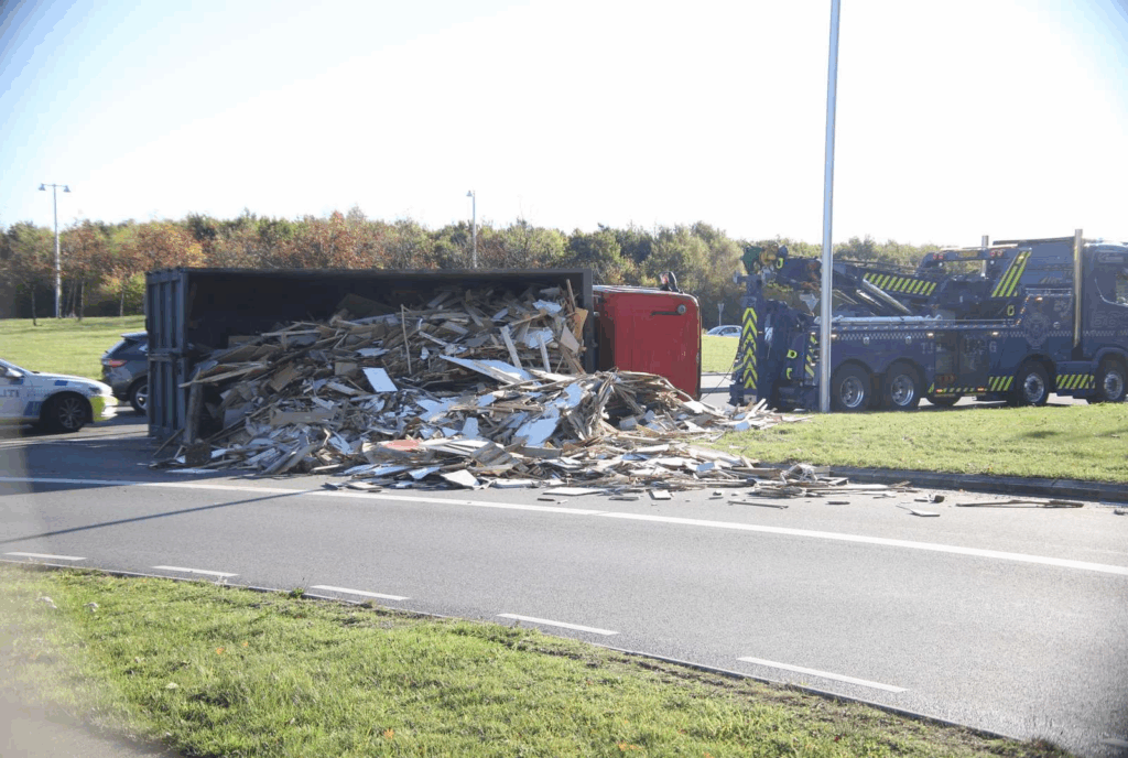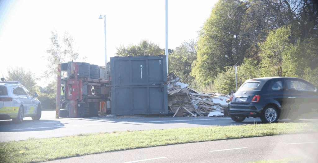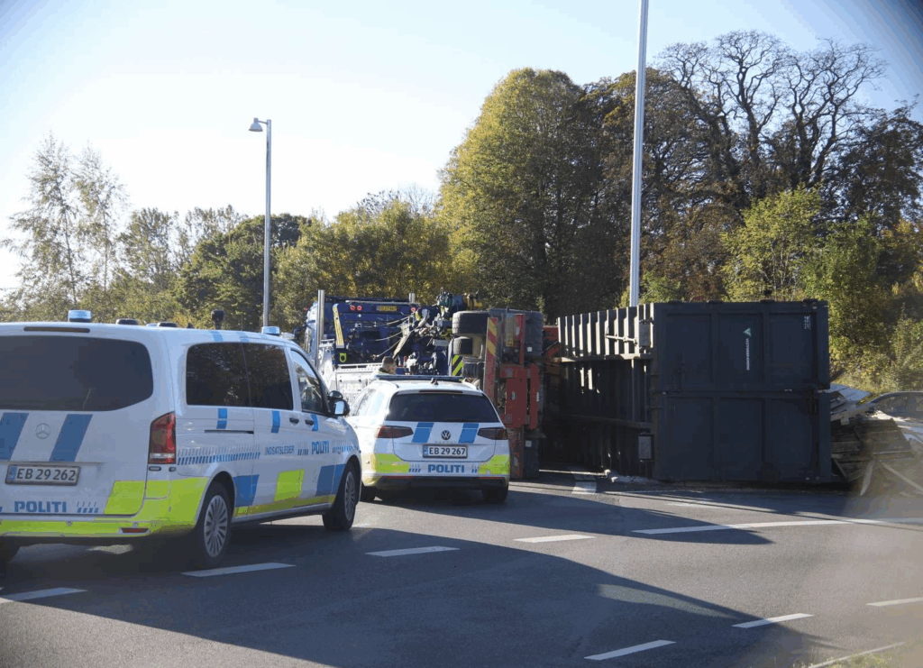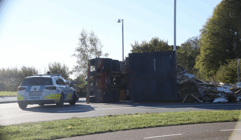 “Vi får en anmeldelse omkring klokken halv ti, om at en lastbil er væltet på vej ud af en rundkørsel”, siger vagtchefen ved Nordsjællands Politi til TV 2 Kosmopol.