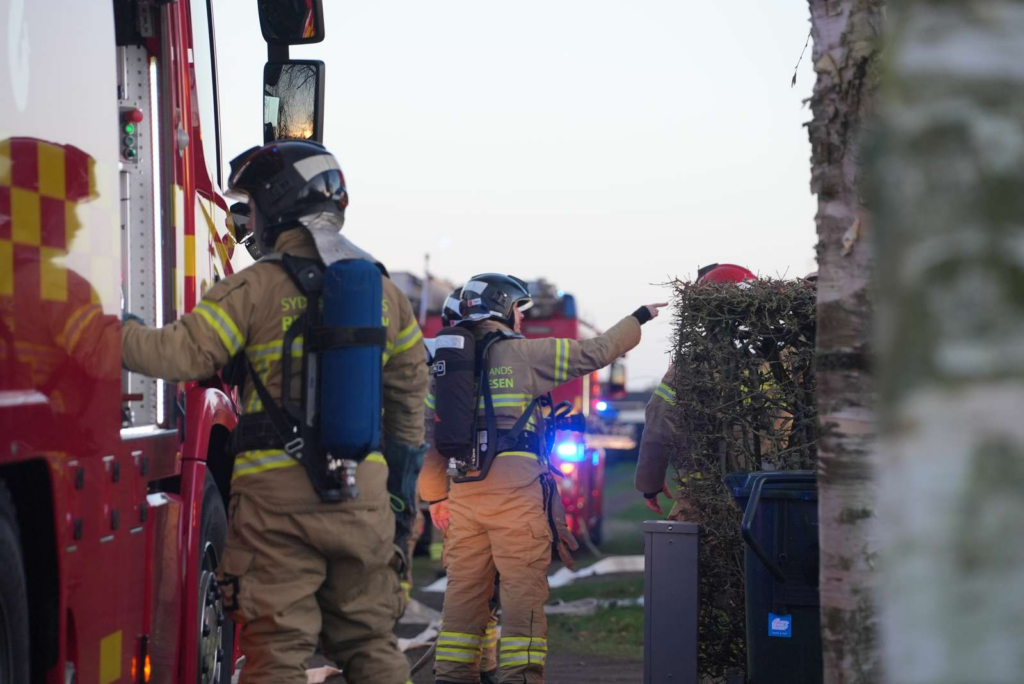 Beredskabsstyrker er massivt til stede omkring huset, og de forløbige meldinger fra myndighederne bekræfter Presse-fotos.dks oplysninger om, at den ældre mand på stolen var til stede i huset, da branden brød ud.