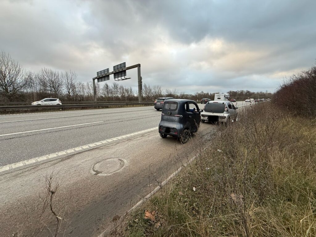 En kabinescooter på tre hjul har forvildet sig ud på motorvejen, hvor der fræser biler i høj hastighed forbi køretøjet.
