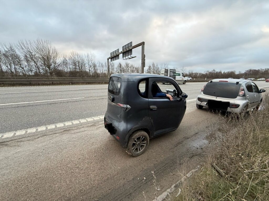 Derfor er det lille køretøj nu kørt ind i nødsporet, hvor en personbil også holder.